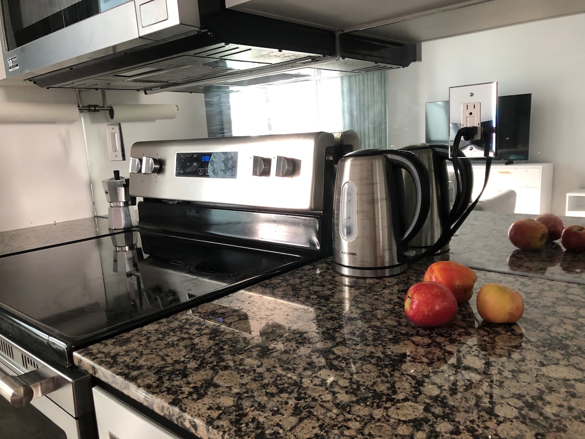 Fáilte go Toronto! Tá an áit seo suite in áit den scoth do do riachtanais taistil go léir. Go hiontach le haghaidh turas gnó nó fóillíochta. Táimid lonnaithe 5 nóiméad ó Ionad Rogers/Túr CN, TIFF, agus i bhfad níos mó! Tá BTW, Nobu Toronto béal dorais! Tá an seomra folctha feistithe go hiomlán, agus tá an chistin lán le gach rud a theastódh uait chun cócaireacht/bácáil a dhéanamh duit féin agus do do theaghlach. Táimid gar d'Iompar poiblí ar nós Carranna Sráide & Fobhealaí lasmuigh/bia laistigh sa Cheantar Siamsaíochta.