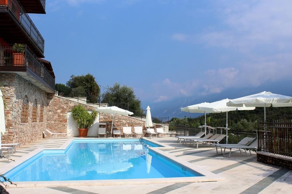 Árasán 54 troigh cearnach le rochtain dhíreach ar an linn snámha agus ar an ngairdín, le radhairc lánléargais ar Loch Garda. Suíomh iontach agus príobháideach. Úsáid an ghairdín agus na linne snámha, príobháideacht agus scíth sna spásanna móra lasmuigh. Foirgneamh nua - aimseartha ó 2015. Bealach isteach príobháideach agus neamhspleách, neart páirceála. Glanadh dian. Príobháideacht iomlán. Ceadaítear peataí beaga.