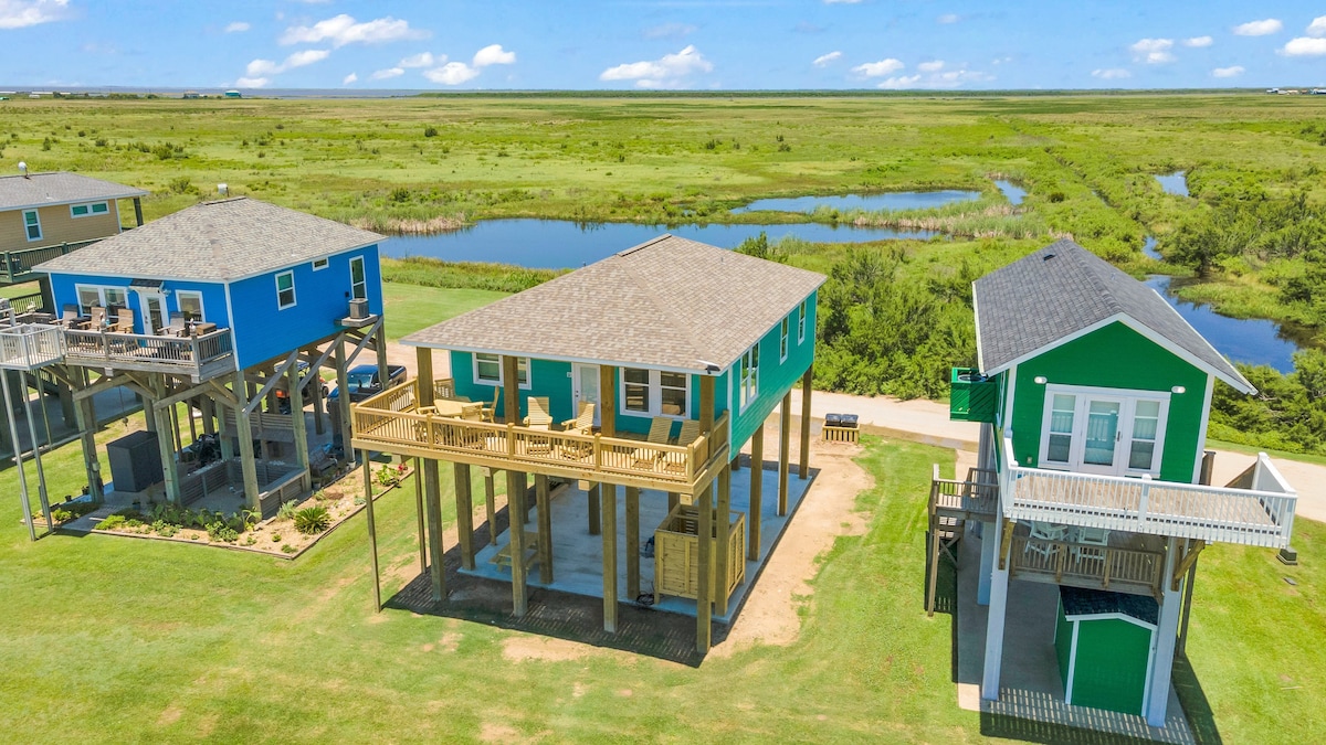 Is tearmann 3BR/2BA cois trá é Lazy Gator in Gilchrist! Codlaíonn sé 10 le 2 leaba rí agus seomra bunc saincheaptha. Bain sult as radhairc aigéin, cithfholcadán lasmuigh, Teilifíseáin Chliste, cistin gourmet, cluichí , Wi - Fi & snáithíní atá oiriúnach do pheataí. Níl le déanamh ach céimeanna a thabhairt chuig an ngaineamh & nóiméad chuig Crystal Beach + Galveston Ferry . Foirfe do theaghlaigh & do ghrúpaí — cuir do shaoire ar an trá in áirithe inniu!