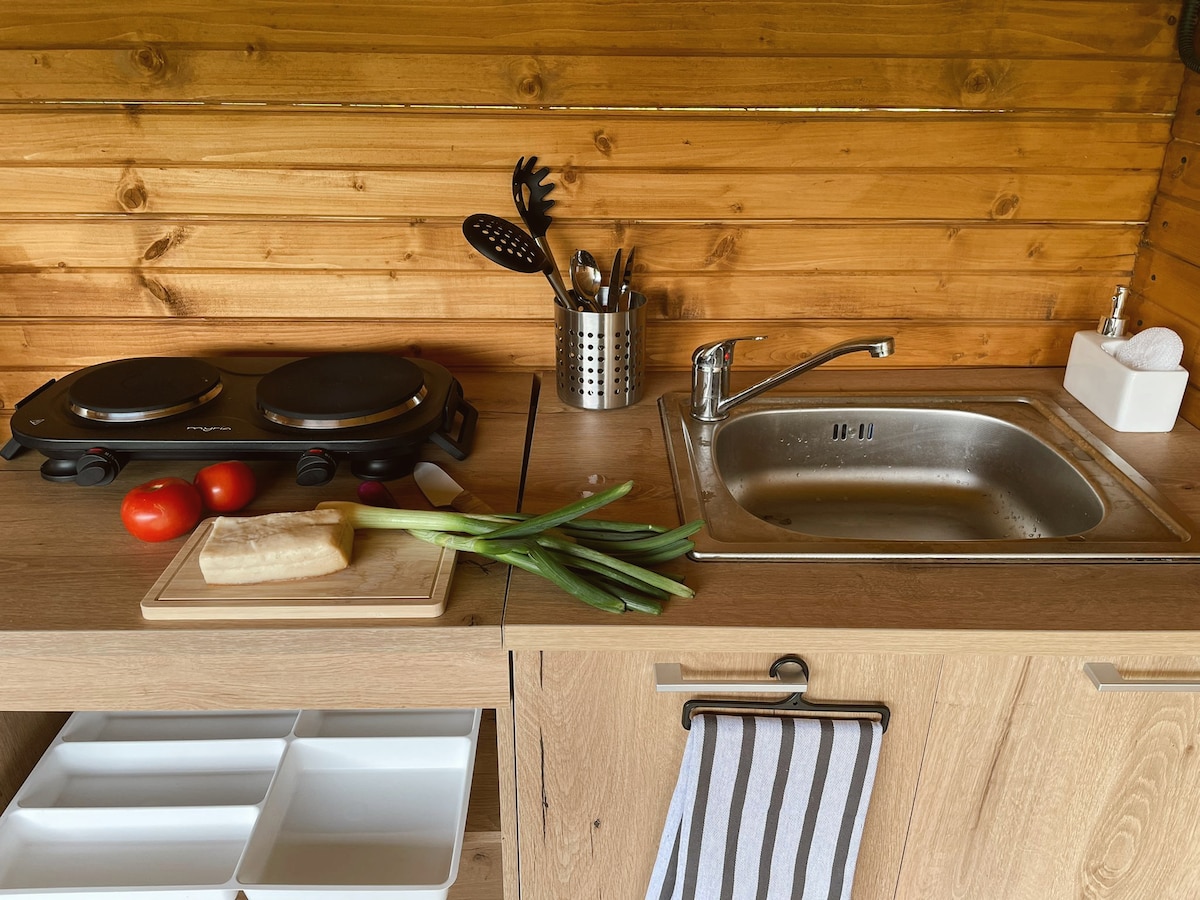 Bhí do pháistí i gcónaí ag iarraidh dul ag campáil, ach nach bhfuil tú ag lucht leanúna? Is é ár bpuball glampála an réiteach foirfe. Tá an puball uathúil, ag cruthú compord na leapacha rialta go léir duit, seomra folctha príobháideach ina bhfuil leithreas agus cithfholcadán agus cistin phríobháideach bheag. Tá an seomra folctha agus an chistin suite ar an ardán príobháideach ar a bhfuil an puball suite. Ciallaíonn sé seo go bhfuil ardán príobháideach agat i ndáiríre, le bord picteilíní agus scáth fearthainne, áit ar féidir leat taitneamh a bhaint as an radharcra síochánta.