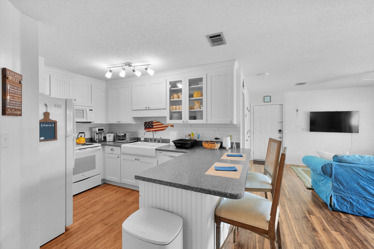 Bain sult as an saol 30A! Is árasán geal 2BR/2BA é Twickenham a thugann rochtain thapa duit ar an trá, linn snámha pobail iontach agus cúrsóir leictreach príobháideach le hiniúchadh éasca a dhéanamh air. • Seomraí codlata compordacha ina bhfuil línéadach tí den scoth • Cistin ina bhfuil earraí cócaireachta, earraí itheacháin, caife agus eile • Rothair saor in aisce, fearas trá & páirceáil • Teilifíseáin chliste + Wi - Fi ardluais • Ceamaraí slándála lasmuigh • Oiriúnach do pheataí Sáróstach, 100+ léirmheas iontach! Cuir do dhátaí in áirithe anois sula n - imeoidh siad.