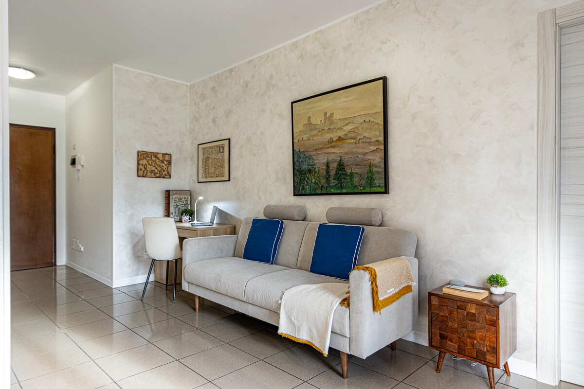 Árasán geal teolaí dhá sheomra atá suite in áit straitéiseach chun dul chuig: - Ospedale Humanitas(1.4km) - Fóram Assago Unipol(5.6km) -IEO (8.8km) - Fear Milano (12km). Lonnaithe ar an gceathrú hurlár in ionad cónaithe mór nua - aimseartha, atá feistithe le hardaitheoir, clós inmheánach agus carrchlós in aice láimhe. Níl an stad Grandi - Buozzi a bhfreastalaíonn na príomhlínte bus air, an stad tram 15 Via Cabrini agus ollmhargaí éagsúla ar nós Esselunga ach siúlóid 5 nóiméad ar shiúl freisin.
