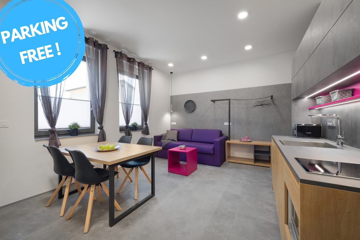 Bain sásamh as an árasán nua - athchóirithe, iontach glan seo atá feistithe go hálainn le haerchóiriú. Déantar troscán saincheaptha chun soláthar a dhéanamh do do riachtanais agus gach rud ba chóir duit a iarraidh le haghaidh fanacht álainn in Ljubljana. Línéadach leapa agus tuáillí curtha ar fáil. Páirceáil saor in aisce i ngaráiste slán béal dorais ar fáil duit. Tá an t - árasán suite díreach 650 m ón Triple Bridge agus 600 m ó The Railway Station. Is féidir na nithe móra go léir a shiúl.