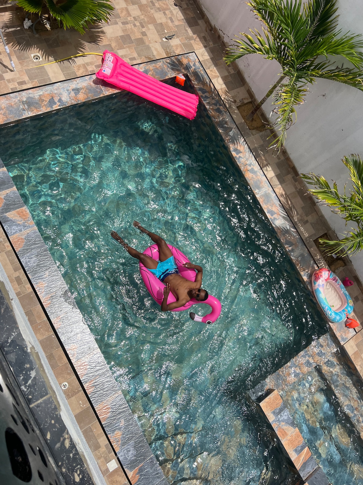 Villa álainn fairsing aerchóirithe le linn snámha os cionn na talún, I sráidbhaile idir an chathair agus an tuath Lonnaithe 30 nóiméad ó aerfort Blaise Diagne (11 chiliméadar) Siúlóid 5 nóiméad go dtí an trá Siopaí in aice láimhe (cógaslann, bácús) Auchan 12 chiliméadar ar shiúl Tá lár chathair Dakar 30 ciliméadar ar shiúl Rudaí le cuairt a thabhairt orthu: Lac Rose 40 ciliméadar ón teach Sráidbhaile turtair 27 ciliméadar Saly 42 ciliméadar ar shiúl Bandia Reserve 42 ciliméadar ar shiúl