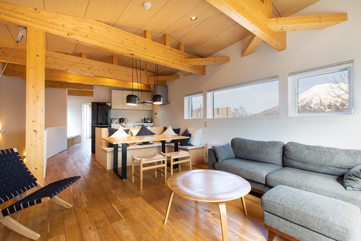 Níl sé suite ach turas bus tointeála 2 nóiméad ó Niseko United Ski Resort. Tá áit chodlata do 6 aoi sa sealla nua - aimseartha seo agus tá seomra suí, cistin, níochán agus 2 sheomra leapa ann (is lochta spáis oscailte é ceann acu). Sa samhradh bain sult as beárbaiciú lasmuigh den lóiste, le radhairc Mt Yotei. Tá beárbaiciú ar cíos agus tacair lónadóireachta ar fáil! Níl Sealla Cosáin ach 10 -15min siúil go dtí an t - ardaitheoir sciála is gaire (Family Run) i lár Hirafu. Agus gan ach 50 méadar ar stad bus tointeála Niseko (Kabayama Kita).