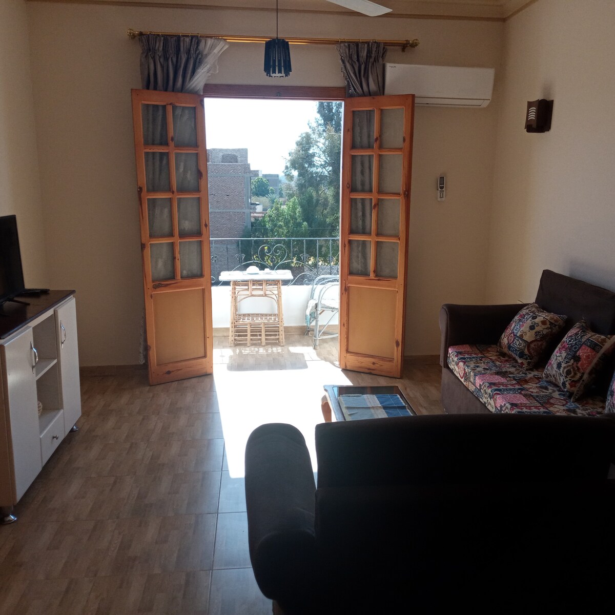 Árasán solais nua - aimseartha deco nua - aimseartha le 2 bhalcóin, radharc nile teoranta. Plean oscailte maireachtála, cistin & áit itheacháin. Feistithe go hiomlán agus cistin mhaith. Leapacha compordacha agus aerchóiriú. Lucht leanúna i ngach seomra. Siúl isteach sa chithfholcadán & sa seomra feistis. In aice le rampa báid/farantóireachta agus ollmhargaí & bialanna beaga. Níl ach 50 méadar go dtí an Níle