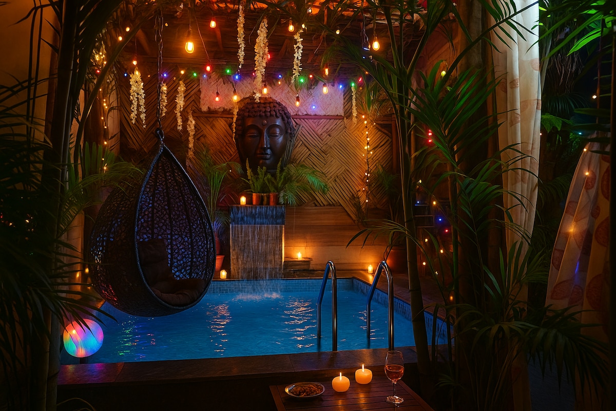 You'll love this unique and romantic escape. Jacuzzi bath tub in the beautiful AC bedroom Bamboos Hut and party friendly beautiful terrace garden with lots of plants and flowers. Clean washroom , full privacy and separate entry. Couple Jacuzzi 6×4 with water points. 1 double bed and 1 bunk bed (2+1). Lighted up outdoor dining. Additional AC cabin with double bed. 7 of a family /friends can dine, party stay and sleep over. Food as per our affordable menu as a multi cosine chef available.