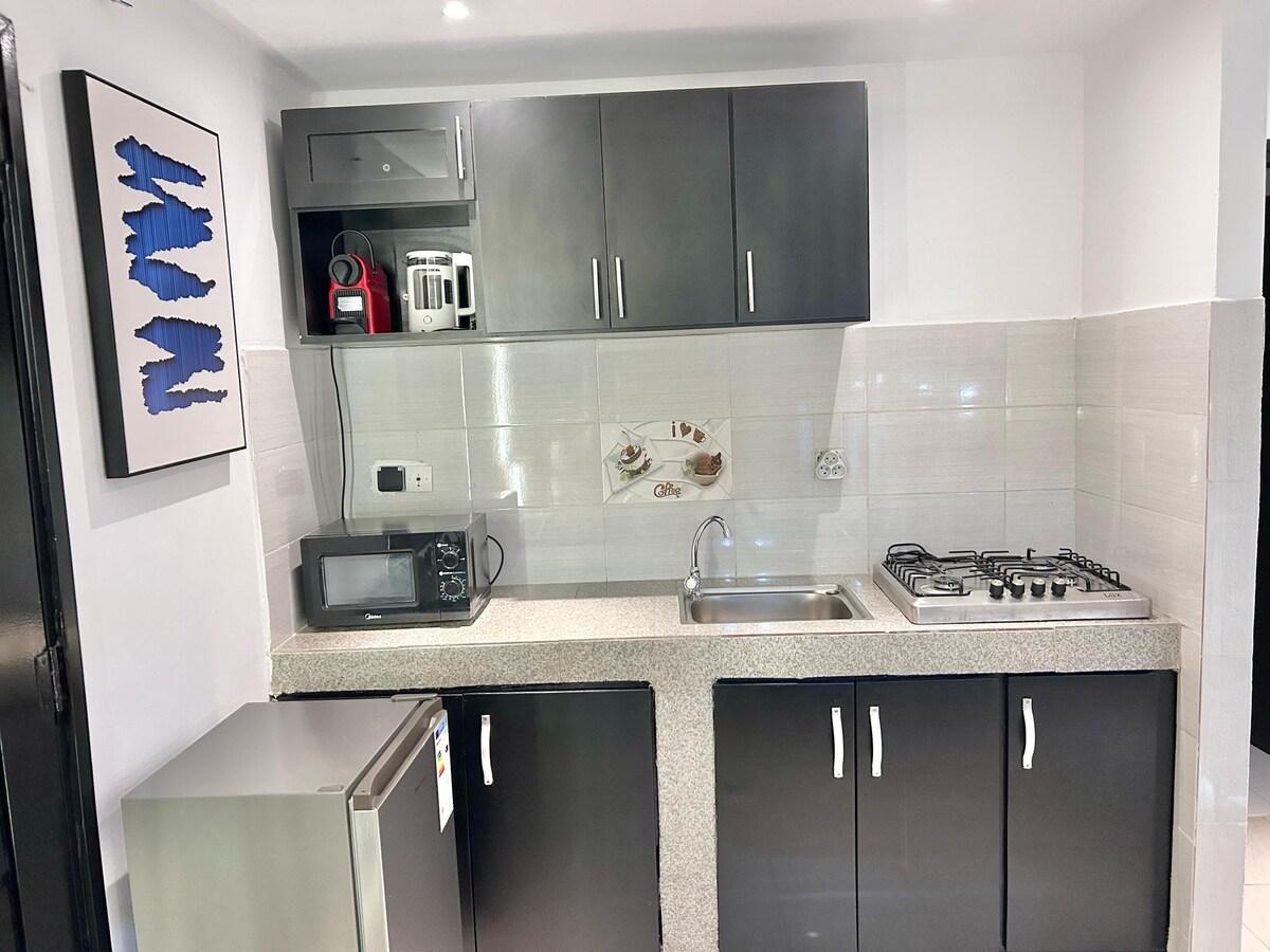 Árasán atá suite i ngar don bhóthar gar do shiopa, do bhialann, d'ollmhargadh. Bain sult as rochtain éasca ar gach rud ón mbonn baile seo atá suite go foirfe. Tá an stiúideonna geala compordacha seo foirfe do thaistealaithe turasóireachta, gairmiúla, lánúineacha agus buiséid.