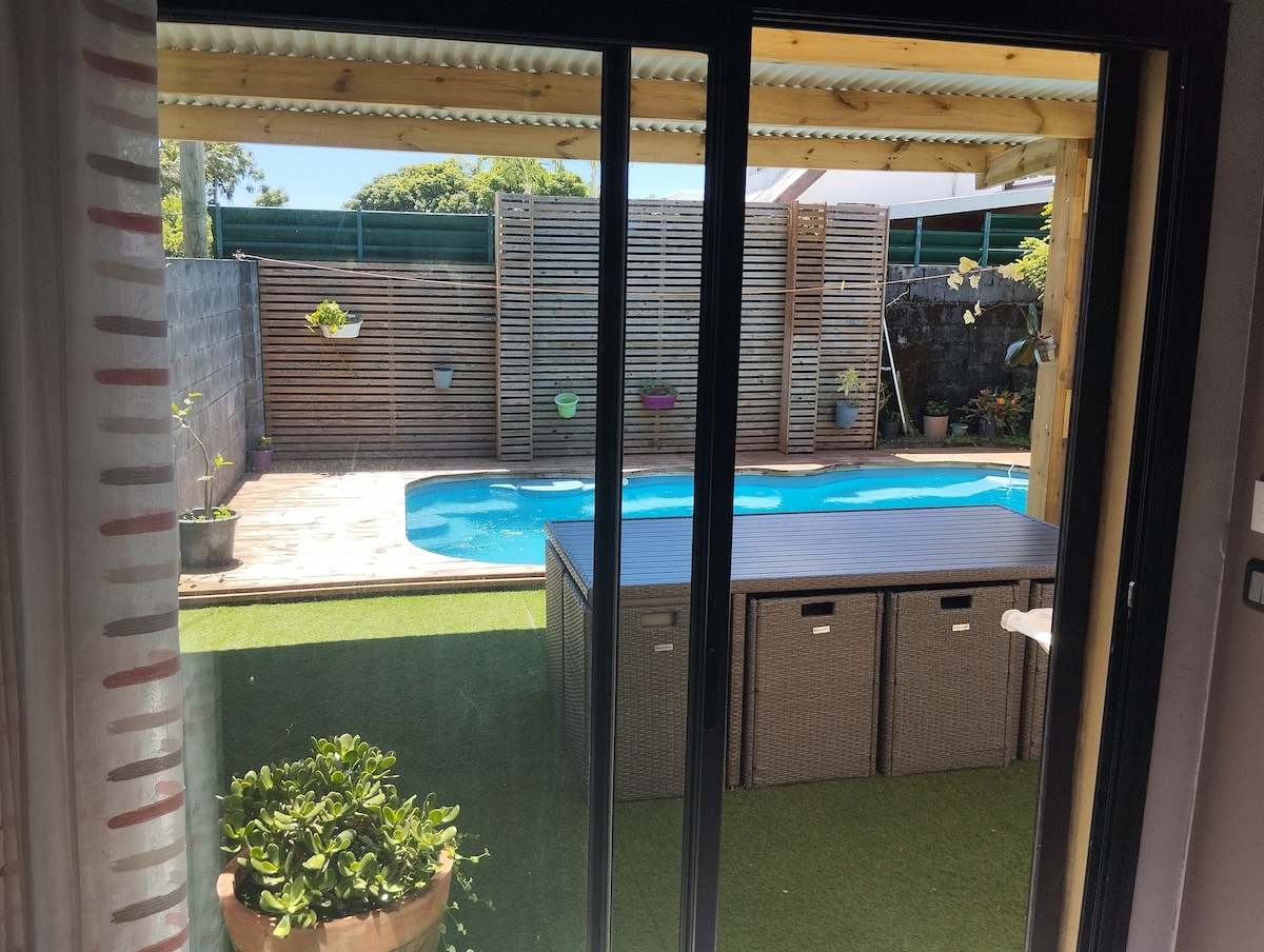 Ag lorg cúinne bunaidh nó fiú beagáinín corraitheach Creole in atmaisféar teaghlaigh Creole, Vien a zot = Fáilte! Feistithe le 4 sheomra le haghaidh achar dromchla 30 m2, is é sin seomra leapa aerchóirithe ina bhfuil leaba dhúbailte + 1 leaba bhreise, 1 vardrús, 1 drisiúr agus 2 lampa Creole, cithfholcadán Iodálach, leithreas, doirteal (meaisín níocháin roghnach ar 5 euro) agus paitió beag. Le cistinéad oscailte. Chomh maith le hardán clúdaithe a fhéachann amach ar an linn nua sáile phríobháideach 20 m2