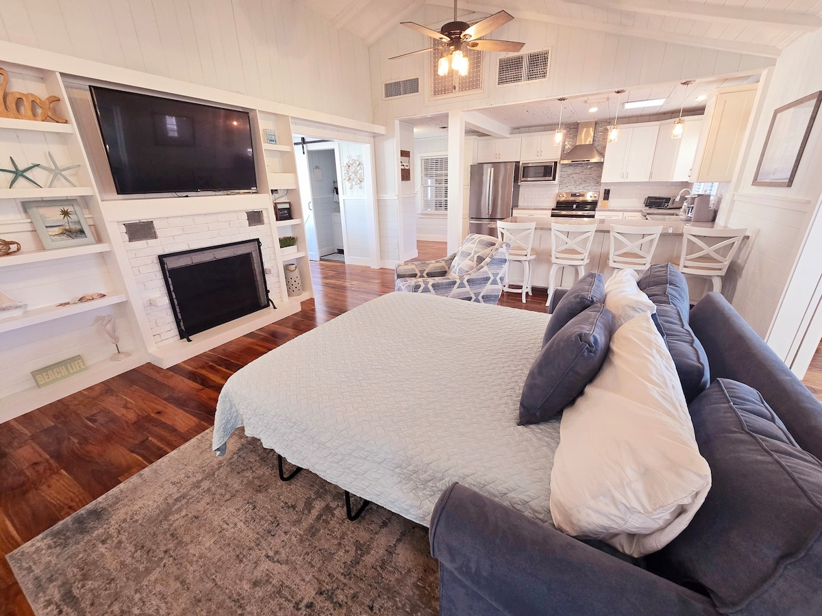 Bain sult as saol éasca sa teach trópaiceach nuashonraithe seo! Tá do lanai príobháideach scagtha foirfe chun scíth a ligean laistigh/lasmuigh gan stró, le linn snámha théite agus limistéar clúdaithe itheacháin/lonlainne ina bhfuil teilifís 58" lasmuigh! Tá an taobh istigh den teach geal agus oscailte le maisiúchán cósta aoibhinn agus go leor spáis le scaipeadh amach. Cuirimid gach rud a theastaíonn uait ar fáil le cistin, gríoscán gáis, seomra cluiche, fearas trá, tuáillí, Luchtaire EV! I gcomharsanacht chiúin le rochtain thapa ar thránna AMI IMG, páirceanna agus cosáin!