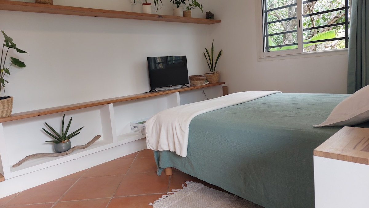 Ar imeall na farraige, tá ár stiúideo 40m2 neamhspleách ar an teach (atá suite os coinne). Roinnfimid an geata isteach agus an gairdín. Beidh rochtain dhíreach agat ón stiúideo ar ardán mór, nach bhfuil clúdaithe. Idir an traidisiún agus an nua - aoiseacht, tá sé nua - fheistithe agus aerchóirithe, túsphointe idéalach chun barántúlacht Oirthear an Reunion (St benoit, Salazie, Ste Suzanne) a fháil amach. Beidh áthas orainn fáilte a chur romhat agus comhairle is fearr a thabhairt duit maidir le do shaoirí gearra. Slán go fóill!