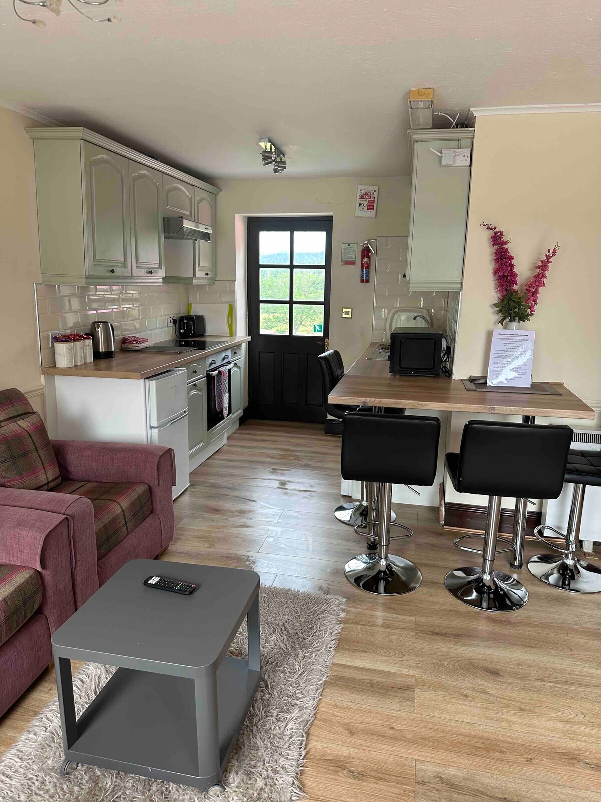 Bungaló féinchuimsitheach ina bhfuil seomra folctha ina bhfuil folcadán agus cithfholcadán, seomra suí, dinnéar cistine lánfheistithe lena n - áirítear meaisín níocháin, iarann le clár iarnála, cócaireán leictreach, micreathonnán agus reoiteoir cuisneora. Seomra leapa fairsing le leaba dhúbailte agus spás oibre/bord gléasta ríomhaire glúine oiriúnach le triomadóir gruaige. Tá an bungaló suite go maith ar thailte ár bpríomhtheach agus tá páirceáil lasmuigh den bhóthar ar fáil.