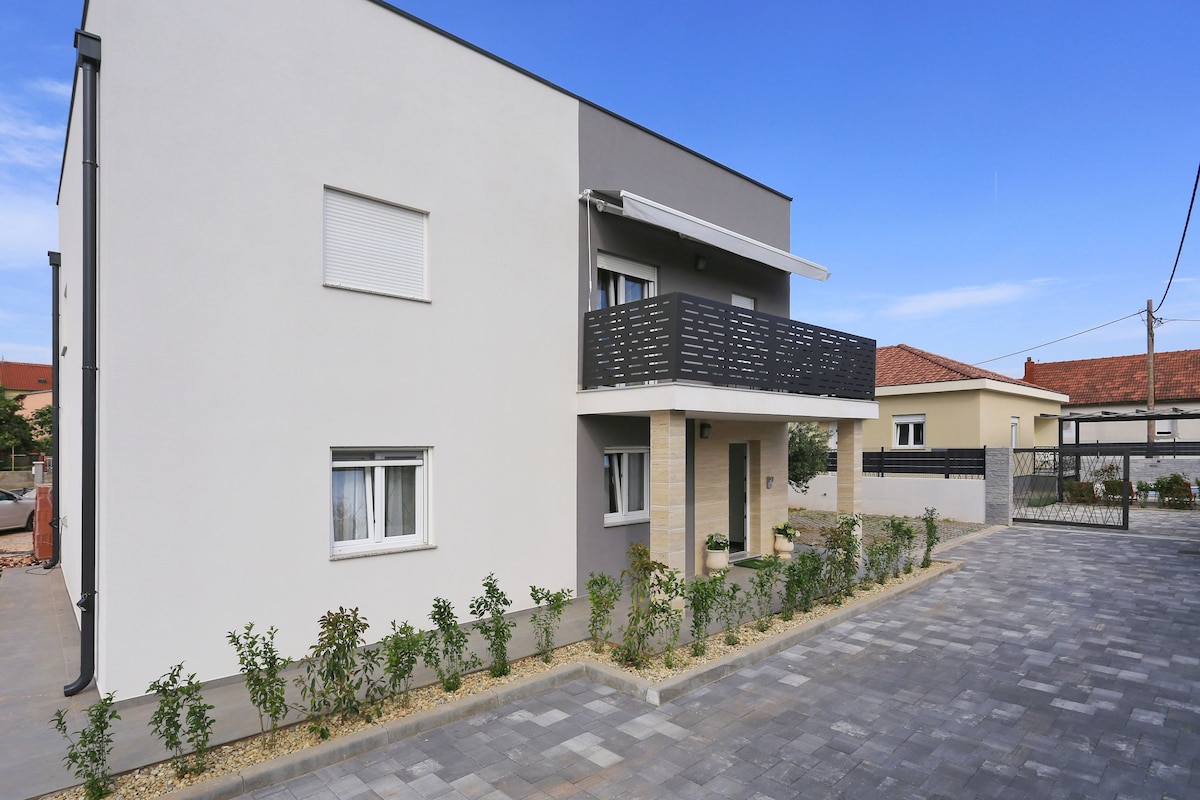 Lig do scíth le do theaghlach san áit theolaí seo, díreach ar an bhfarraige. Tugann an chéad ró chuig an bhfarraige sos uathúil agus teagmháil leis an dúlra. Áilleacht na mboladh, na bhfuaimeanna agus na ndathanna nach féidir ach le hoileán amháin a bheith acu . Tá an teach nua , tógáil 2024. Maisithe i stíl chluthar Mheánmhuirí agus feistithe go saibhir. Tá radharc na farraige ó gach seomra leapa . Tá an t - achar chuig siopadóireacht agus bialanna 300 m . Tá an t - oileán ceangailte go maith le línte farantóireachta ó Zadar agus Biograd na moru, gach uair an chloig.