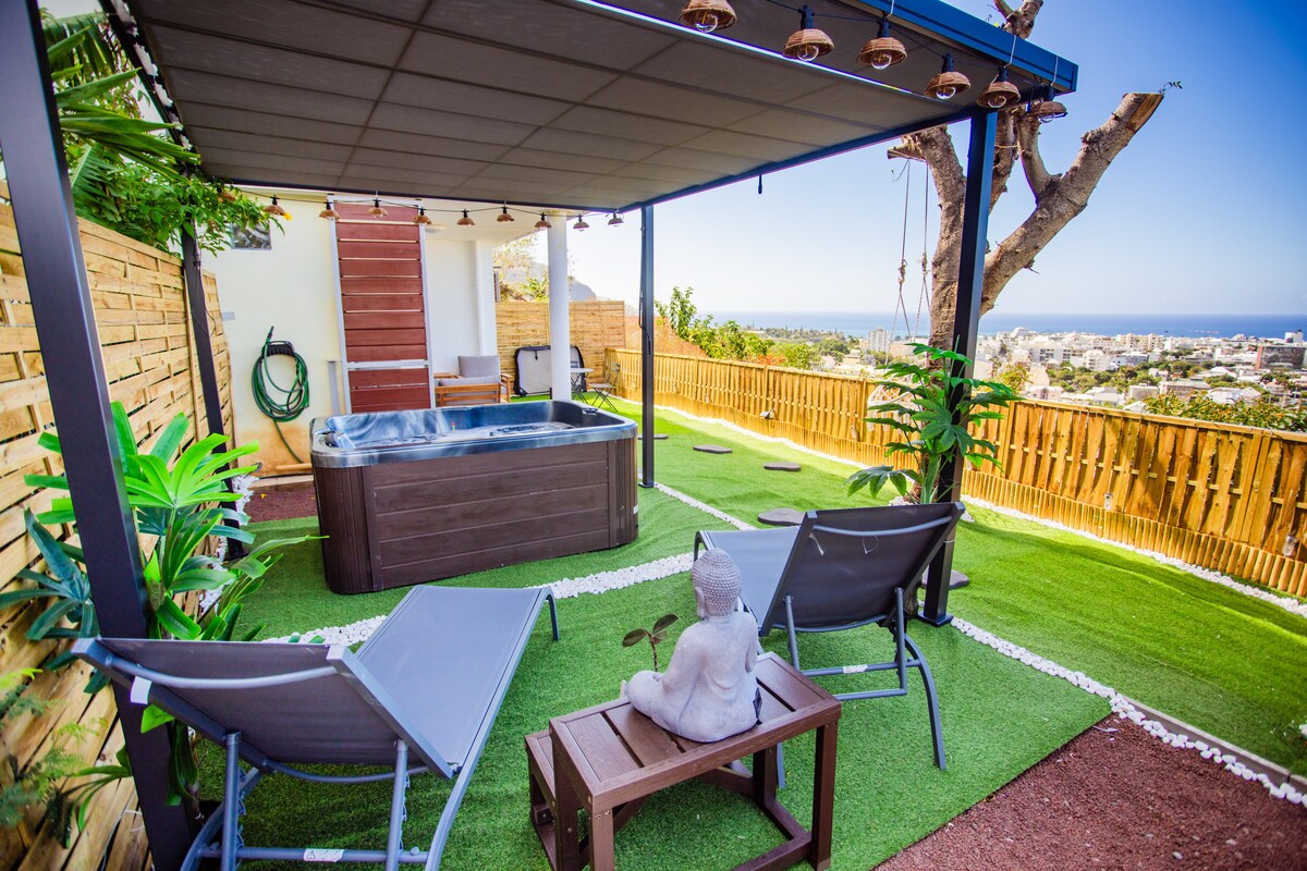 Fáilte chuig an árasán fairsing uathúil 65m2 déphléacsach seo. Suite ar an 11ú agus ar an urlár uachtair den áit chónaithe is airde i dtuaisceart an oileáin, bainfidh tú taitneamh as radharc lánléargais ar an bhfarraige agus ar an sliabh ó cheann den dá bhalcóin. Lonnaithe 13 nóiméad ón aerfort, ar Blvd Sud (ais lárnach), beidh sé oiriúnach do do ghnó nó do stad turasóireachta. *Pictiúrlann bhaile i seomra le balcóin *Linn snámha ina gcónaí * Páirceáil phríobháideach *Aerchóiriú *Netflix *Snáithín