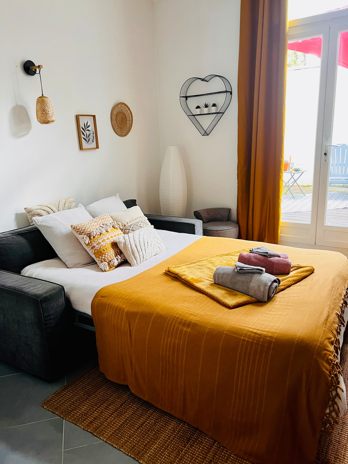 Lóistín 40 m2 F2 in aice lenár dteach, bealach isteach neamhspleách, spás páirceála sa chlós dúnta ag geata uathoibríoch. Gach saoráid de shiúl na gcos. - Seomra folctha ina bhfuil cithfholcadán, doirteal agus leithreas - Seomra suí ina bhfuil cistin fheistithe (sorn, cuisneoir, micreathonnán, gríoscán oighinn, soithí...) agus leaba thoilg do bheirt - Seomra leapa neamhspleách le leaba dhúbailte, vardrús/vardrús agus teilifíseán (is féidir é a bhogadh go dtí an seomra suí) + teachín linbh ar iarratas. Níl aon bhosca glais ann.