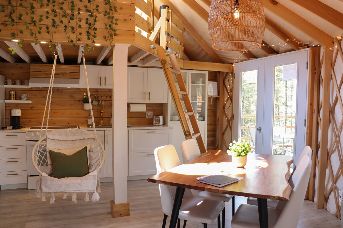 Beidh sé ar oscailt i séasúr an tsamhraidh (8 Bealtaine - 31 Deireadh Fómhair 2026) agus i Séasúr an Gheimhridh (deireadh seachtaine Eanáir-Aibreán amháin). Cuirimid fanachtaí aon oíche ar fáil! Bain sult as an yurt cosúil lasmuigh den ghreille chúlráideach seo (faoi thiomáint na gréine), feistis eicléictiúla - atá suite i dtimpeallacht phríobháideach foraoise. Ar an deic cuirtear BBQ le huirlisí cócaireachta agus tacar paitió ar fáil i rith an tsamhraidh - níl aon uisce ann i rith an gheimhridh (Samhain-30 Aibreán) - cuirtear leithreas beag ceimiceán ar fáil. Bain sult as an tsimplíocht chompordach agus lig do scíth sa dúlra; seirbhís sabhna ar fáil ar $50.