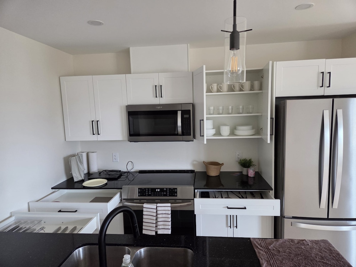 Áit shaoire, phríobháideach, chiúin agus shuaimhneach á lorg agat! Árasán íoslaigh 1 seomra leapa le taobh cistine a thagann le cuisneoir, micreathonnán, citeal, grúdaire caife, sceanra chomh maith le huirlisí bunúsacha freastail le haghaidh d'úsáide. Tá deasc léitheoireachta agus cathaoir inchoigeartaithe sa seomra, muileann tráchta le haghaidh aclaíochta agus leaba bhanríona atá teolaí le haghaidh codlata foirfe. Cuirtear tuáillí úra/glana ar fáil. Tá sé suite i dtimpeallacht shuaimhneach den chathair le córas bus idirthurais feidhmiúil.