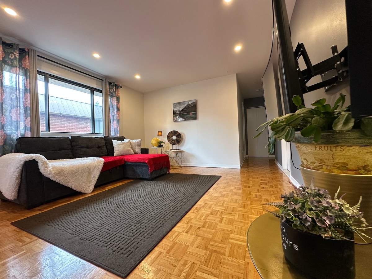 Lóistín iomlán den scoth, le bealach isteach neamhspleách, cuirfidh sé gliondar ort. Tá sé suite go maith i gcroílár Terrebonne i Mórcheantar Montréal, gar do shiopaí grósaera, do bhialanna agus do nithe is díol spéise, d'áit choillithe 2 nóiméad ar shiúl, do chúrsa gailf, do chosáin rothar agus do dhaoine eile, déanfaidh an lóistín seo d'fhanacht taitneamhach. Árasán príobháideach ina bhfuil seomra leapa mór agus leaba bhanríona, cistin fheistithe, seomra suí, teilifíseán le Amazon Fire TV, triomadóir níocháin, clós, páirceáil ar fáil Mórbhealaí 640 agus 25 in aice láimhe, bus 1 nóiméad siúil uait