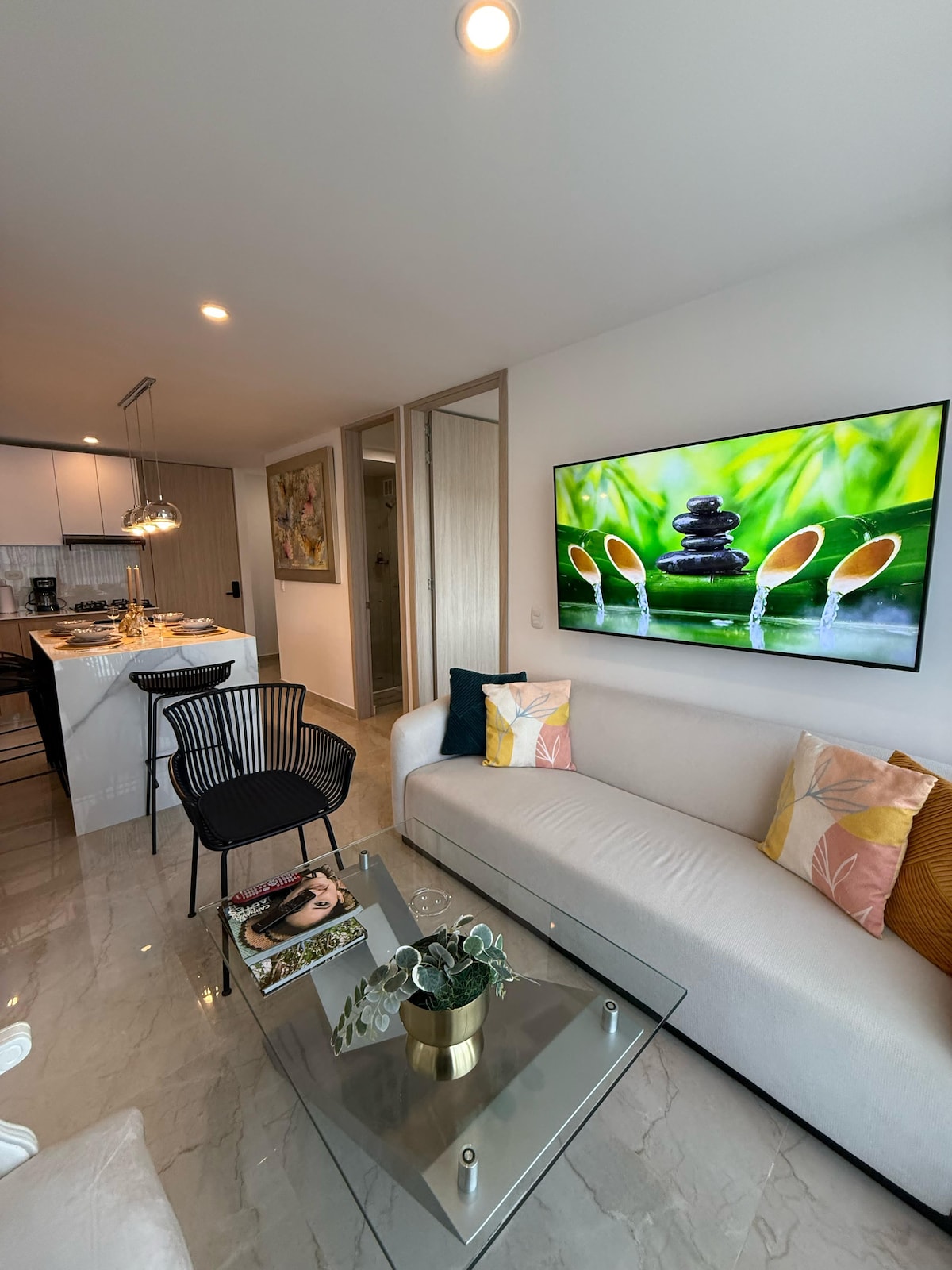 Seomra fairsing ina bhfuil cistin iomlán ina bhfuil tocht ar mhéid banríona ar ardchaighdeán. Seomra folctha maisithe go blasta le cithfholcadán uisce te! Áit mhór lasmuigh atá clúdaithe le scíth a ligean agus chun do scíth a ligean. Radharcanna áille ar an gcé agus ar an aigéan ón bpaitió agus ón halla. Siúlóid ghearr dhá nóiméad chuig príomhphlás agus piara Puerto na Colóime.