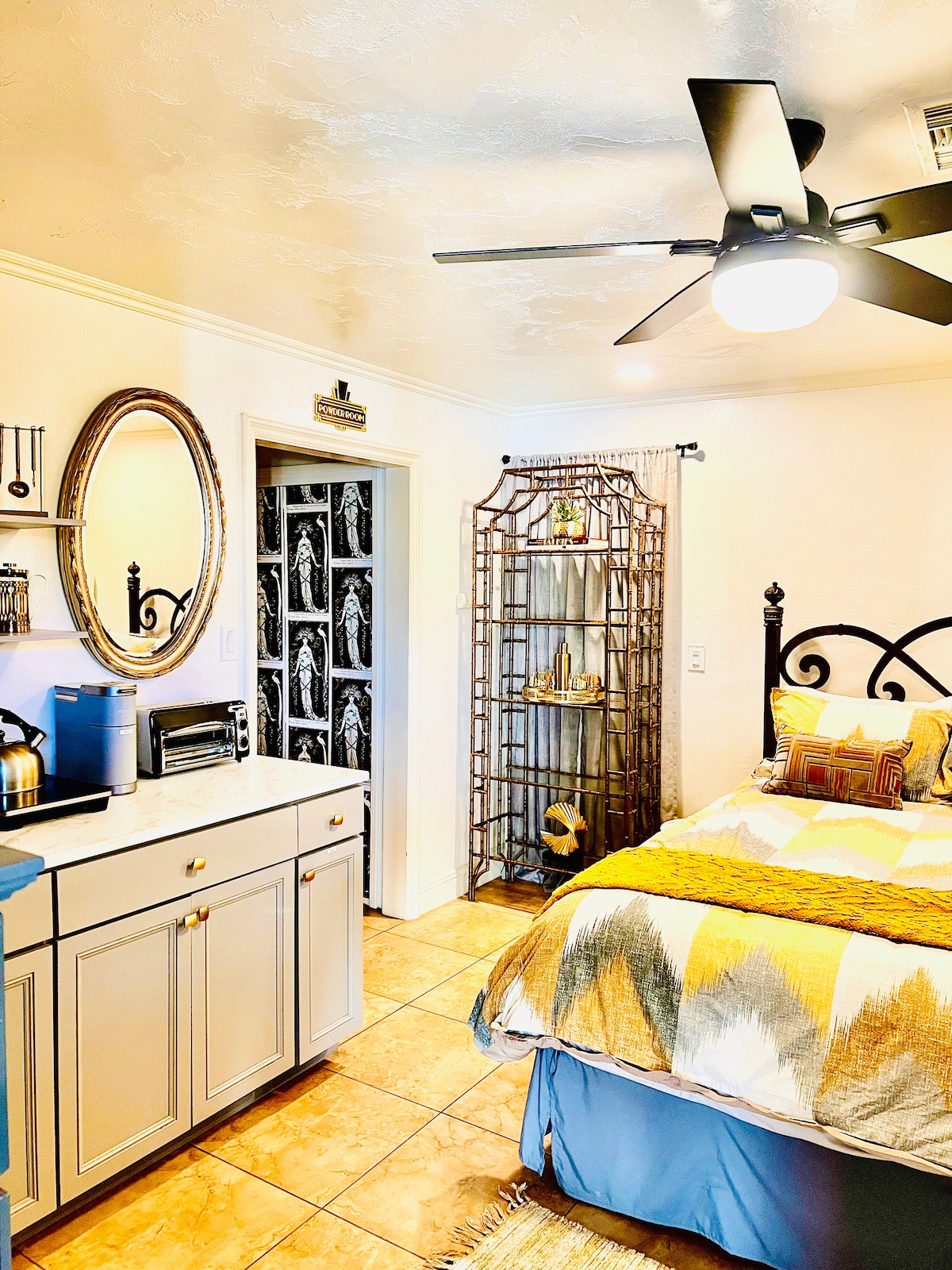 Tá an stiúideo taobh thiar den phríomhtheach agus tá sé go hiomlán príobháideach agus scoite ón bpríomhtheach. Tá sé ciúin agus cluthar agus rinneadh é a athchóiriú i mí Mheán Fómhair 2018. Áirítear leis Wi - Fi, teilifís chábla leathnaithe, NetFlix, agus Hulu ar theilifís chliste. Tá caibinéid agus cuntair nua, doirteal feirme, micreathonnán thar an raon, oigheann agus sorn, agus miasniteoir sa chistin. Tá an chistin feistithe go maith le potaí agus pannaí, miasa, babhlaí, gloiní, etc. Tá doras nua ar an taobh amuigh cruach suiteáilte an - slán. Neamh - thobac amháin.