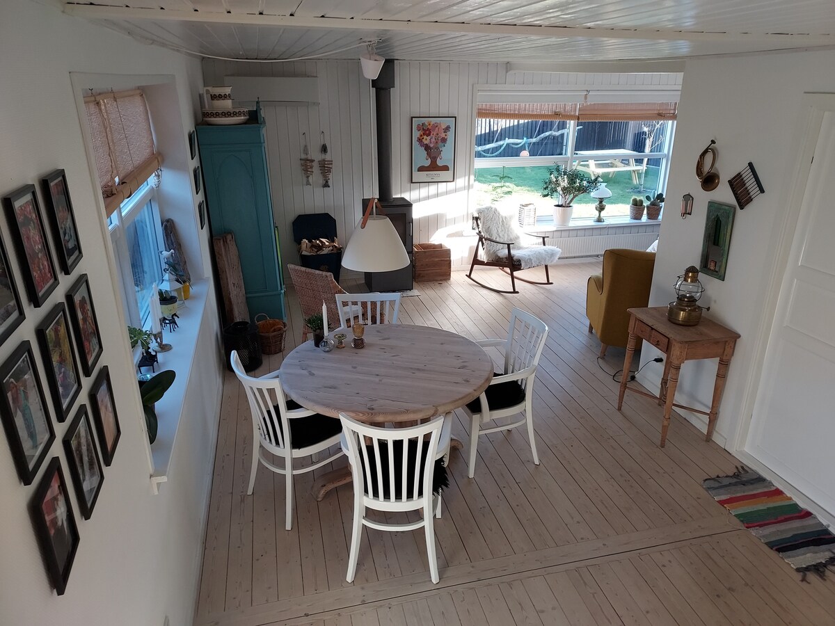 Teach samhraidh uathúil ó "Aisling Samhraidh" TV2. Tá an teach feistithe ag na rannpháirtithe ón gclár tithíochta "Summer Dreams ". Tá an teach go hiomlán nuathógtha in ábhair bhlasta agus níl sé ach 300 méadar ó thrá álainn atá oiriúnach do pháistí. Socraíonn an teachín an stáitse le haghaidh scíthe agus am ardchaighdeáin leis an teaghlach nó le cairde i bhfolcadán agus sabhna fásaigh an tí. Níl sa teach ach siúlóid 2 nóiméad ó Farm Fun, áit iontach do na cinn bheaga.