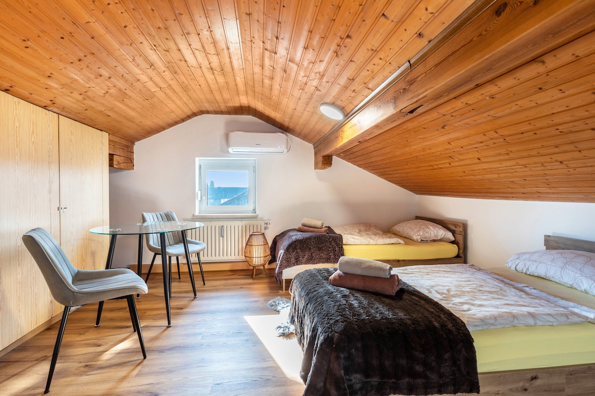 Suíomh uathúil os cionn Loch Attersee – buaileann an dúlra íon le compord inbhuanaithe. Tá ár réadmhaoin suite in áit iontach ar chnoc os cionn Loch Attersee – timpeallaithe ag móinéir leathana, caoirigh féaraigh agus ba. Níl an loch agus sráidbhaile Unterach ach 5 nóiméad ar shiúl ar rothar/carr nó 20 nóiméad ar shiúl na gcos agus tugann sé cuireadh duit dul ag snámh, ag siúl agus ag luí. Tá caiféanna, siopadóireacht, bialanna agus trá saor in aisce ag fanacht leat!