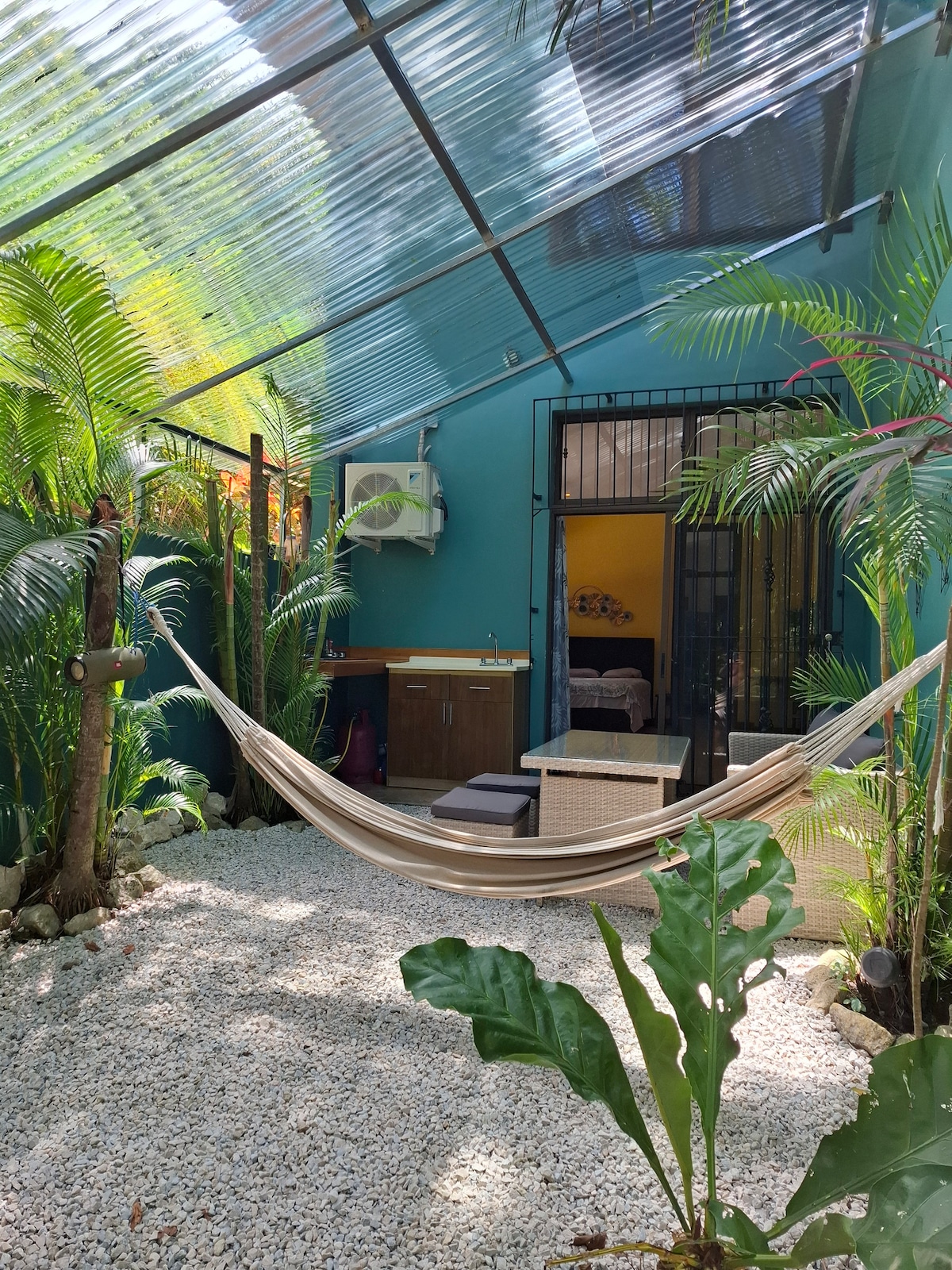Stiúideo deartha álainn le hardán agus gach rud atá uait chun fanacht iontach a bheith agat in Nosara. Cistin dea - fheistithe, a/c, teilifís chábla (teilifís chliste), Wi - Fi 200 Mbps, linn snámha cloiche nádúrtha agus beárbaiciú runcho, agus 5 nóiméad ag siúl go dtí an trá. Lonnaithe in Playa Pelada, tiomáint 4 nóiméad go Playa Guiones, 15 nóiméad go Ostional, agus go leor tránna áille timpeall: Garza, Barco Quebrado, Barrigona, San Juanillo. An surfáil agus na flaithis ióga i gCósta Ríce. Achar siúil ó El Chivo, La Luna, La Bodega agus Olgas.