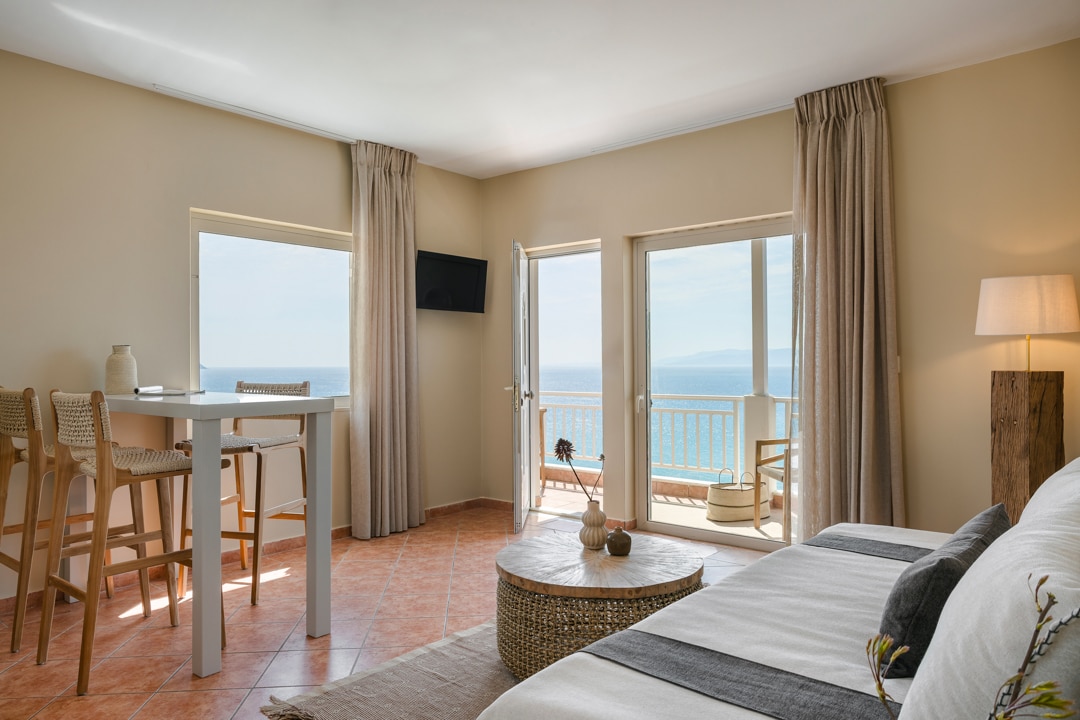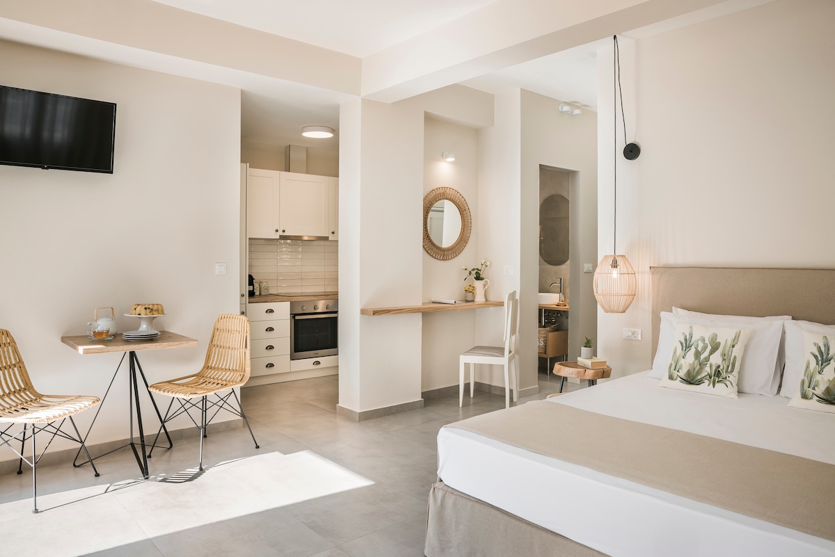 Tá ár lochta suite ar urlár uachtarach an tí aíochta gleoite Cavos Inn, i sráidbhaile gleoite Assos díreach 5 nóiméad siúil ón trá. Deartha chun meascán gan stró de chompord agus de stíl a chur ar fáil, ina bhfuil leaba dhúbailte, cistin lánfheistithe, seomra folctha agus seomra suí in aon spás amháin, le radhairc áille ó na fuinneoga go Myrtos Bay agus Assos. Tabhair faoi deara nach bhfuil aon bhalcóin ann, le do thoil Is féidir leat do scíth a ligean am ar bith ag an bpríomh - ardán agus taitneamh a bhaint as na radhairc iontacha a thagann chun cinn romhat.