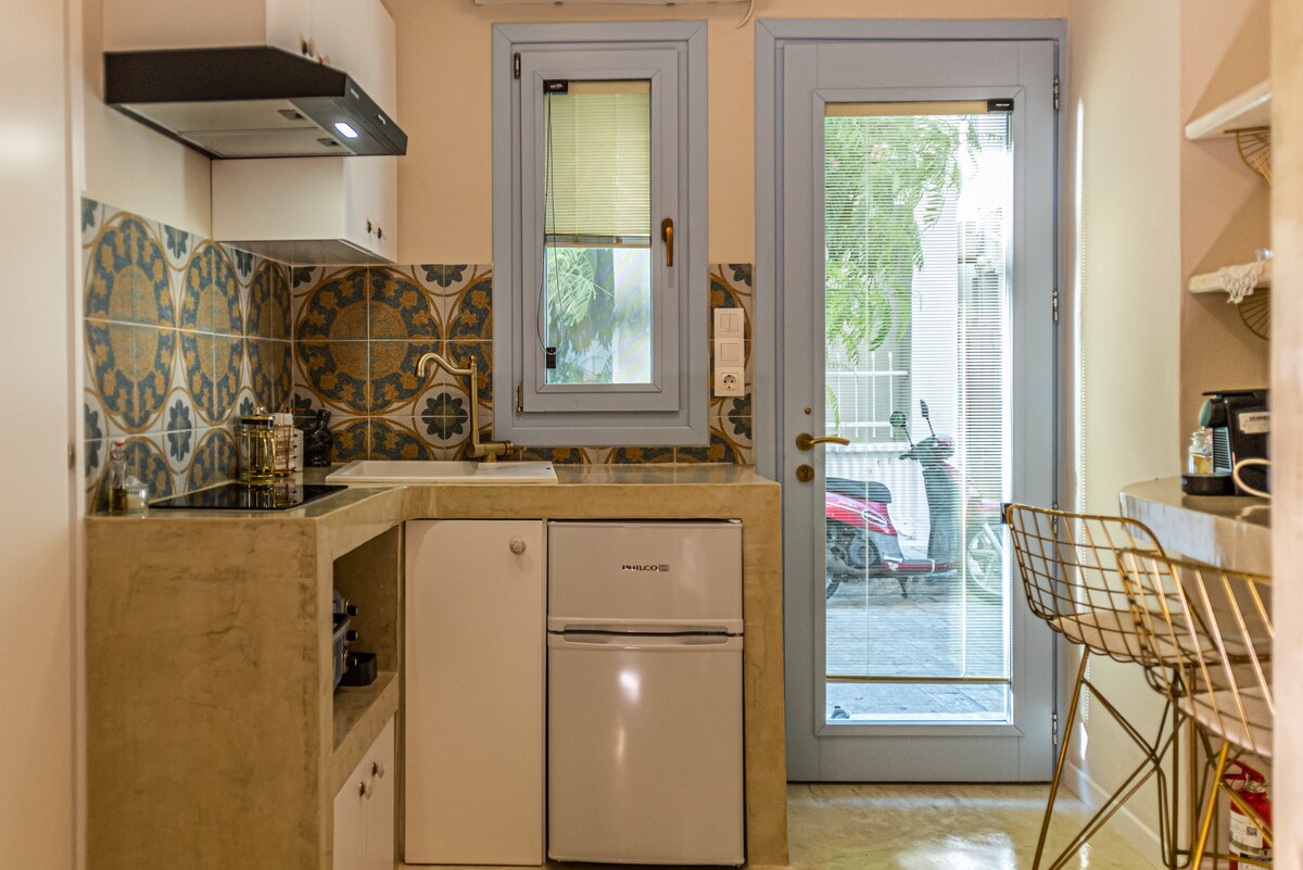 Tá an stiúideo príobháideach deluxe seo suite ar urlár na talún agus tá cúlchlós álainn ina shuí agus bláthanna agus crainn torthaí os a chionn. Laistigh de chúpla céim/soicind tá tú ag príomhchearnóg shráidbhaile Kokkari, an calafort, tránna, bialanna, beáir, siopaí cuimhneacháin, Cógaslann, siopaí grósaera, siopa cúil, gluaisteáin ar cíos, gluaisrothair, scútair, meaisíní ATM, stad bus agus áiteanna páirceála saor in aisce. Rinneadh athchóiriú air in 2020 agus tá sé deartha i mblas traidisiúnta - nua - aimseartha. Tá an ailtireacht uathúil agus nádúrtha.