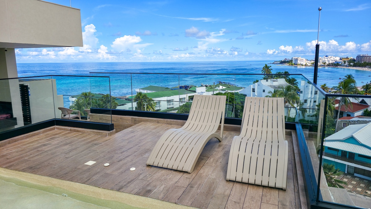 Balcóin phríobháideach jacuzzi Penthouse A/C ag breathnú amach ar an bhfarraige