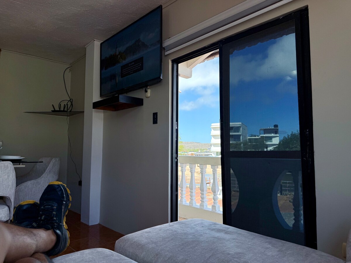 tá ár n - árasán suite in Puerto Baquerizo Moreno, siúlóid 4 nóiméad go dtí an Malecon de San Cristobal agus siúlóid 4 nóiméad go dtí aerfort an oileáin. tá Wi - Fi saor in aisce againn, aerchóiriú inár seomraí agus inár mbalcóiní go léir ina bhfuil radhairc ar an aigéan. Tá ardán mór againn le gríoscán, tolgairí gréine, seomraí réalta agus seomraí bia le húsáid saor in aisce agus ar ndóigh radharc iontach ar an bhfarraige agus ar luí na gréine. 3 sheomra leapa ina bhfuil seomra folctha príobháideach, seomra folctha sóisialta, seomra suí, seomra bia agus cistin.
