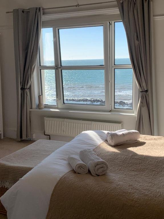 Árasán taibhseach, fairsing, os comhair an deiscirt le radhairc iontacha ar an bhfarraige, gnéithe bunaidh, agus síleálacha arda. Tá éirí na gréine/seiteanna agus machnaimh na gealaí iontach! Idir St Leonards on Sea agus Hastings, agus 30 soicind go dtí an trá! Tá leaba rí sa seomra leapa agus tá leaba dhúbailte sa seomra suí. Is éard atá i gceist le leaba ná cadás/línéadach nite le táirgí neamh - thocsaineacha. Tá Maol ar an 3ú hurlár ach ní go leor staighre agus dá réir sin, radhairc ar an bhfarraige i bhfad ón slua madding! Tá páirceáil saor in aisce in aice láimhe
