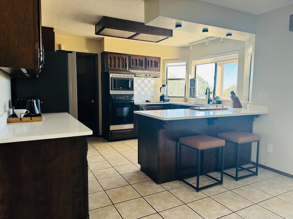 RADHAIRC, RADHAIRC, RADHAIRC ar Sandia's, Soilse na Cathrach agus níos faide anonn!!! Tar abhaile agus lig do scíth le gloine fíona nó tae agus bain sult as an radharc. Tá oileán mór cistine sa teach seo atá i lár an phríomhlimistéir mhaireachtála. Tá an chistin gourmet seo feistithe le rud ar bith is mó a theastódh uait le haghaidh cócaireachta agus siamsaíochta. Tá na leapacha an - chompordach ar fad ( 2 thocht theampur - pedic) le línéadach tí ardchaighdeáin. Tá an suíomh thar a bheith áisiúil do chathair Rio Rancho agus Albuquerque