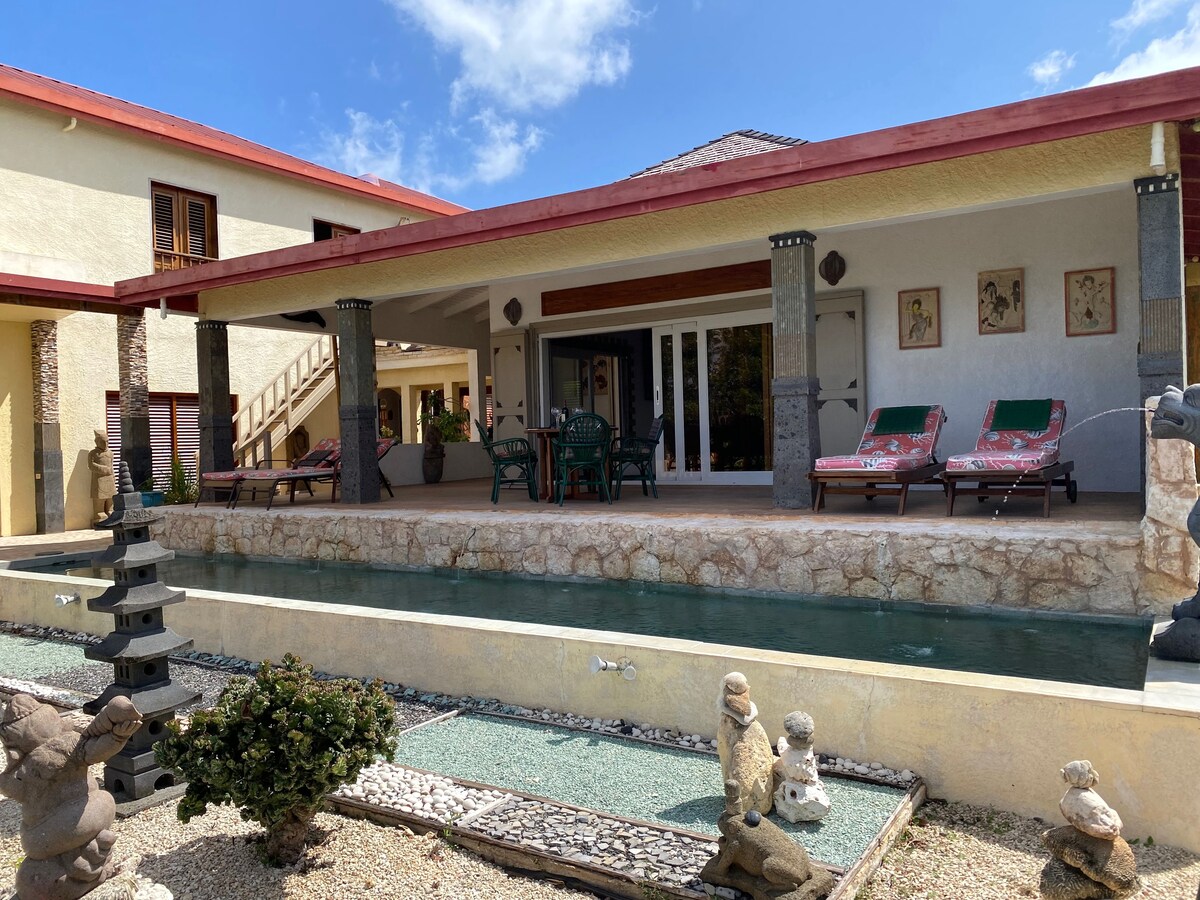 Fáilte chuig do thearmann síochánta oileáin! Ón svuít álainn seo ina bhfuil seomra leapa amháin tá radhairc shuaimhneacha ar na gairdíní trópaiceacha méith. Tosaigh do mhaidin le caife ar an mbalcóin agus tú timpeallaithe ag an nglasra, nó lig do scíth sa tráthnóna le gloine fíona agus tú ag sú isteach an t-atmaisféar suaimhneach. Tá gach rud a theastaíonn uait le haghaidh saoire chompordach dhochoimhdeach sa svuít!