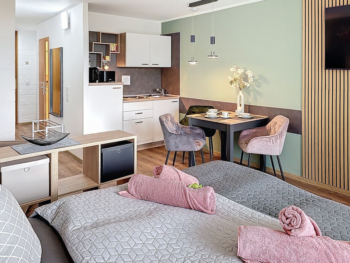 New - le hárasán aerchóirithe 1 sheomra, 35 mhéadar cearnach do bheirt, agus leaba bhreise ar fáil do dhuine eile. Leaba earraigh bosca amháin 180 x 200 cm agus ceann amháin 100 x 200 cm le barrán. Tá micreathonnán, cuisneoir, hob ceirmeach, meaisín caife do chochaill, frother bainne, chomh maith le sceanra agus gréithe sa chistin bheag. WLAN agus teilifís satailíte le haghaidh laethanta drochaimsire. Sciáil, rothaíocht sléibhe, foraois dreapadóireachta, rith toboggan samhraidh agus gníomhaíochtaí fóillíochta eile in aice láimhe.