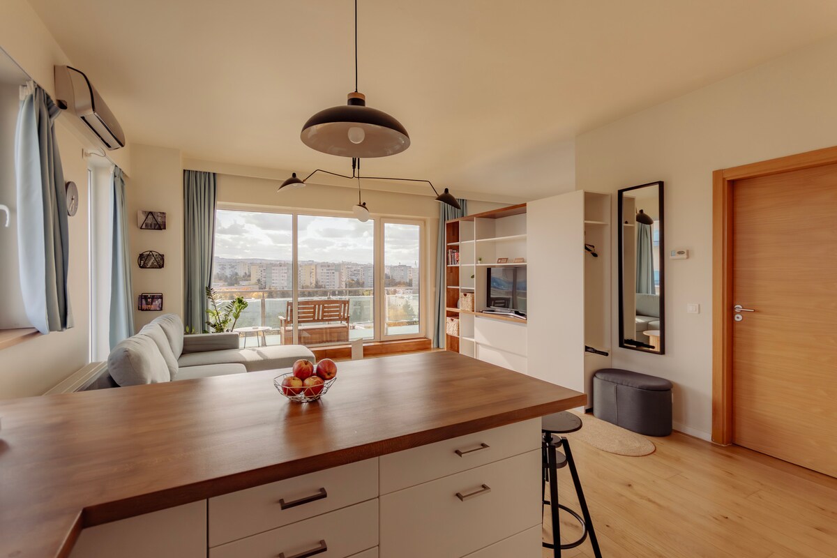 Apartament modern, elegant și primitor, ideal pentru sejururi scurte sau business. Dispune de două aere condiționate, balcon, parcare privată și un spațiu dedicat pentru lucru. Mobilat cu designer, oferă confort premium: pat king-size, bucătărie complet utilată, veselă, dotări moderne și un ambient rafinat, locul perfect pentru relaxare și productivitate.