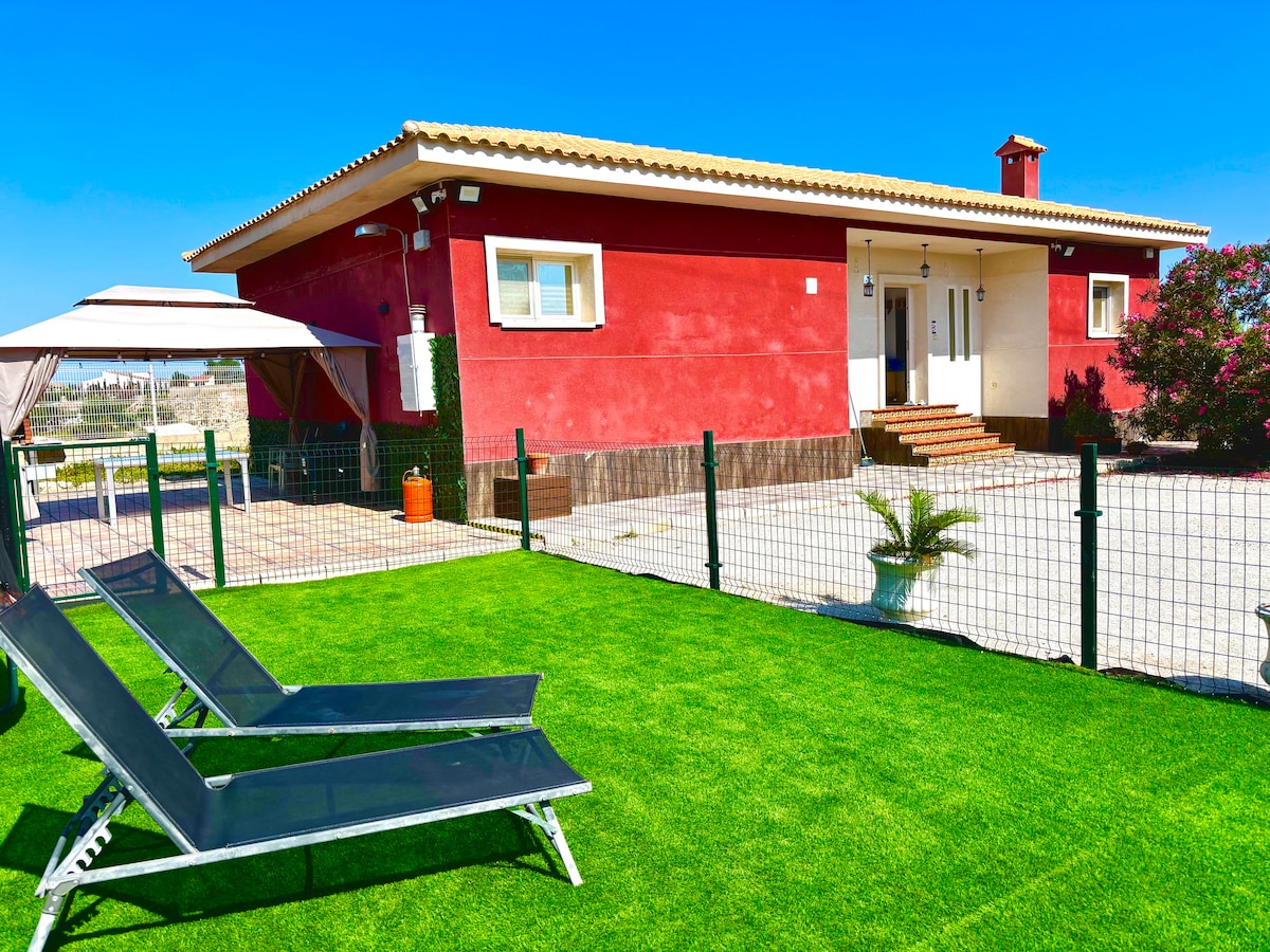 Teach álainn adhmaid ina bhfuil na saoráidí go léir. Cistin mhaith, dhá sheomra folctha, seomra suí, seomra bia, seomra bia agus ceithre sheomra lánfheistithe. A/C agus teas i ngach seomra. Lasmuigh ullmhaithe go speisialta le haghaidh saoire mhaith. Linn snámha, BBQ, Limistéar Chillout, Anann... Is féidir leis an teaghlach ar fad taitneamh a bhaint as an dúlra go compordach. Thart ar 20 nóiméad ón aerfort, agus 15 nóiméad ó thránna Santa Pola.