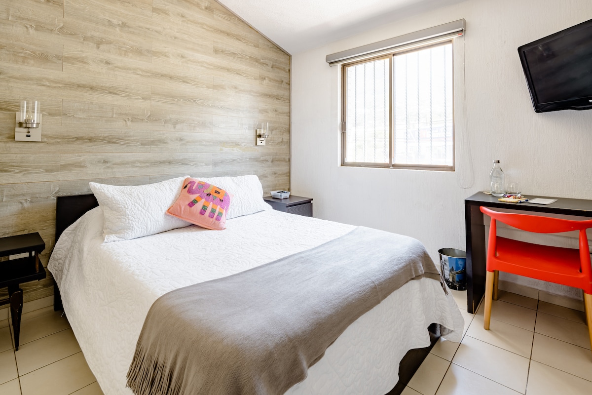 Seomra leapa príobháideach agus neamhspleách, seomra bricfeasta agus seomra folctha le féinseiceáil isteach. Foirfe do mhac léinn nó beirt mhac léinn, oibrithe, nó dóibh siúd a thagann chuig an gConsalacht agus Gnóthaí Eachtracha in Santa Catarina. 5 nóiméad ó Cartetera 57 Monterrey - Saltillo. 30 nóiméad ó lár Monterrey agus Garcia NL. Ar an dara hurlár den teach teaghlaigh le rochtain iomlán neamhspleách Seomra leapa le leaba dhúbailte, bricfeasta le cistin iomlán agus Seomra folctha príobháideach. Páirceáil os comhair an tí