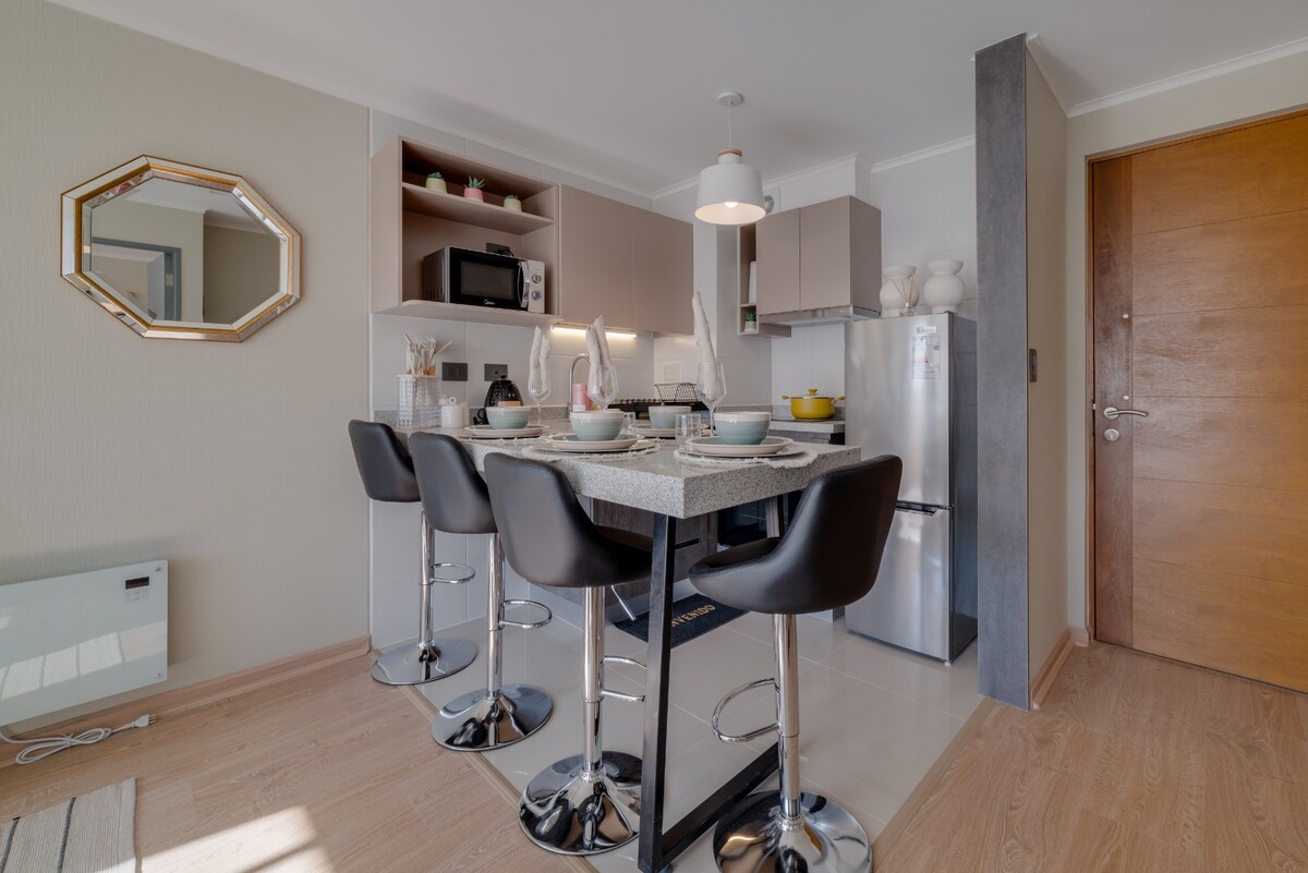 Bain sult as fanacht compordach nua - aimseartha san árasán geal lánfheistithe seo ina bhfuil radharc álainn gan bhac ar an gcathair. Go hiontach le haghaidh turais scíthe agus oibre araon. Lonnaithe cúpla céim ó lár Temuco, tá Wi - Fi ardluais (600 Mb), teilifíseán Cliste le Netflix agus HBO Max gníomhach, agus leaba phréimh chompordach ann a ráthaíonn codladh suaimhneach. Tá níochán, concierge 24/7, agus páirceáil phríobháideach saor in aisce ar fáil san fhoirgneamh.