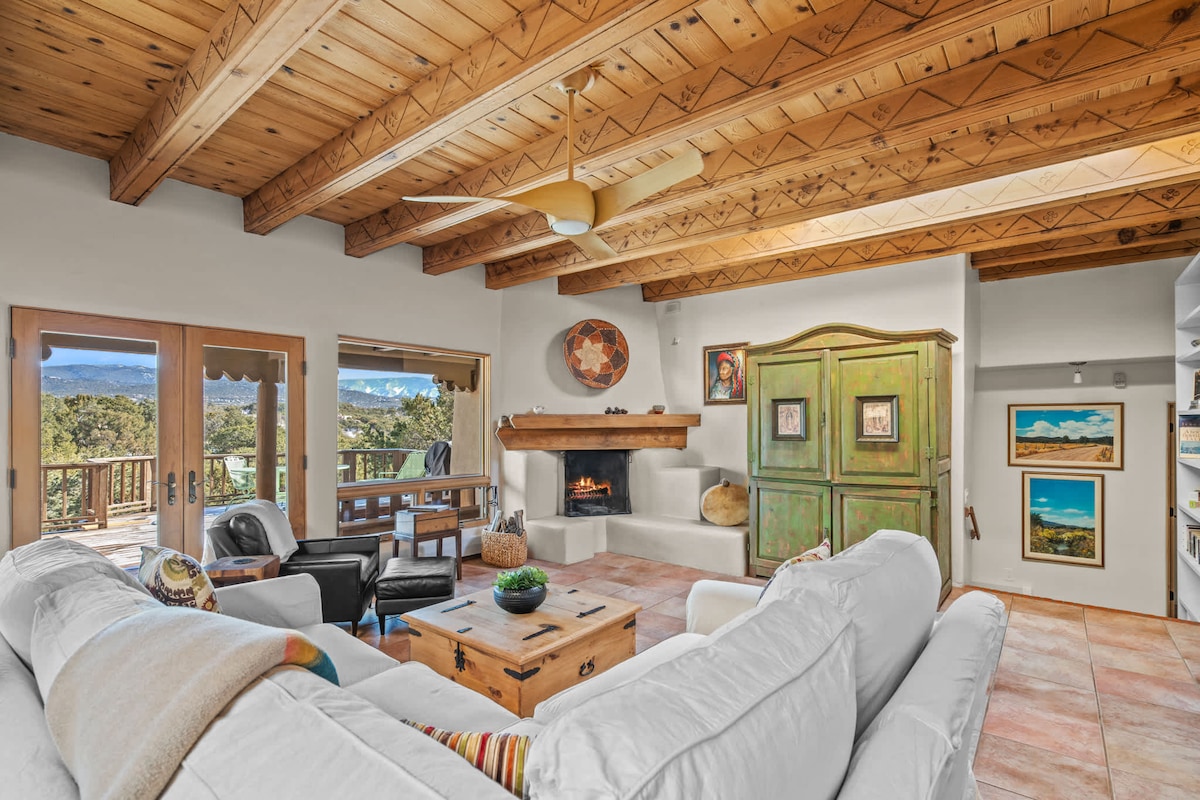 Le síleáil adhmaid, vigas agus corbels, tá an Casita stucco - styled Santa Fe adobe seo lán de sholas agus de dhraíocht le háiteanna suí laistigh agus lasmuigh, cistinéad, urlár tílithe, seomra folctha le cithfholcadán, agus leaba bhanríona. Spéaclaí ó dheas scuabtha d'abhantrach Galisteo agus de Shléibhte Ortiz. Iomairí rollacha crann aitil agus bioráin le carraig dhearg agus arroyos. Rochtain éasca ar Santa Fe Plaza; siopadóireacht agus bialanna. Díreach amach ó Chonair Turquoise agus marcaíocht ar chapall in aice láimhe, Maidrid agus Páirc Shráid Cerrillos.