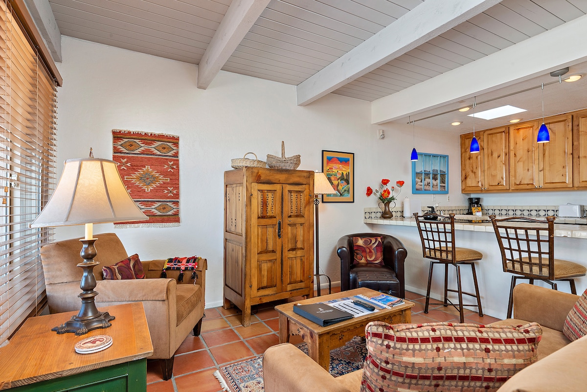 Suíomh den scoth chun féachaint ar éirí na gréine agus ar luí na gréine, tá an t-árasán dea-fheistithe seo ina bhfuil 2 sheomra leapa agus 2 sheomra folctha suite 6 bhloc ón bplás cáiliúil i lár na cathrach! Bain sult as an linn snámha laistigh agus an tobán te am ar bith den bhliain. Siúil chuig an Plaza le haghaidh imeachtaí, bialanna, siopaí agus músaeim. Tá Fort Marcy Historic Park díreach trasna an bhóthair, áit a bhfuil radhairc iontacha ar Santa Fe agus ar Shléibhte Sangre de Cristo. Gar do sciáil agus do shiúlóireacht fhada freisin. Tar agus faigh eolas ar an gCathair ar bhealach Difriúil! Ceadúnas Gnó: 157625