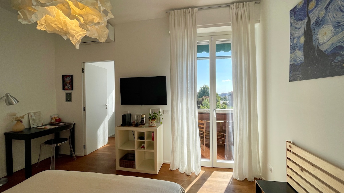 Óstan síochána i gcroílár Milano. Árasán geal teolaí, le gach compord agus balcóin mhór shreafa. Glan, ciúin, timpeallaithe ag glaise agus ag an am céanna ceangailte go maith leis an lár agus na fobhealaí ó thram 24 a stopann os comhair an dorais. Is féidir Duomo, Fondazione Prada, Bocconi, Ollscoil Stáit, sráidbhaile Oilimpeach, Porta Romana a bhaint amach ar an tram i 20 nóiméad. Tá an chomharsanacht go hálainn agus tá gach saoráid faoin teach: earraí grósaera, beáir, bialanna, níochán, cógaslann.