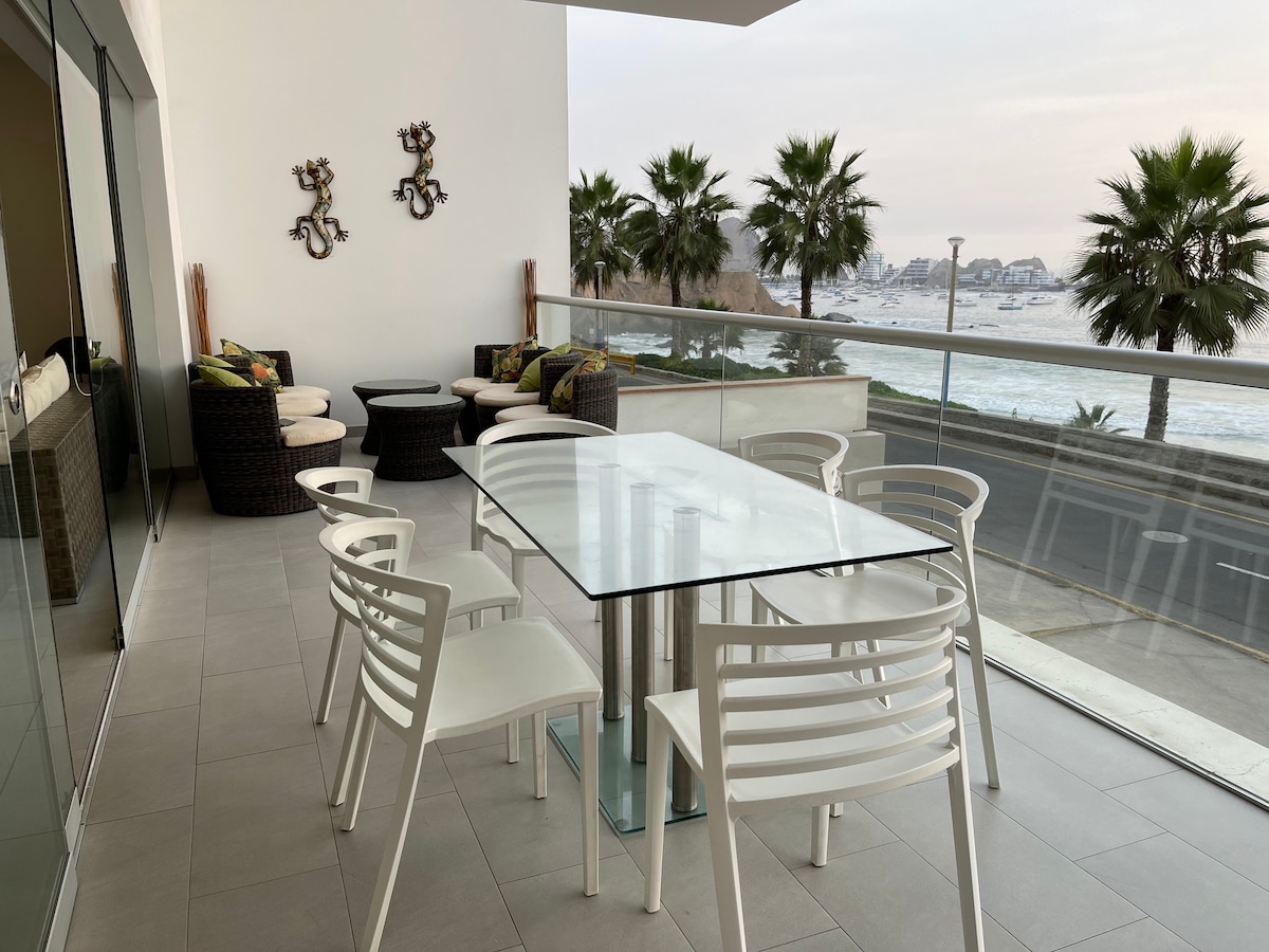 Amplia terraza con espectacular vista al mar desde todos los ambientes. En primera fila, bajas las escaleras y estás en la playa. Full equipado, vajilla, internet, 2 tv con cable, 5 camas, cochera cerrada. Uso exclusivo de todo el departamento. Te sentirás seguro y tranquilo. Cerca a parque, mercado, restaurants, bodegas. Hermoso malecón para agradables paseos en ambiente familiar. Petfriendly. Sólo lleva tus toallas y artículos personales! No tenemos parrilla pero puedes llevar la tuya.