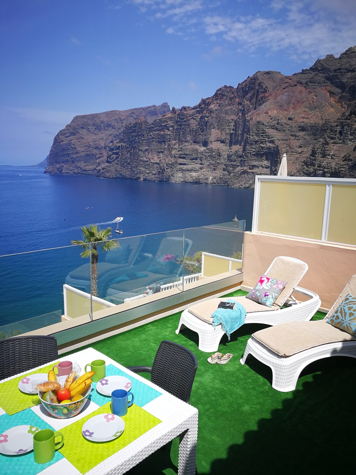 Fáilte go dtí ár n - árasán álainn, nua - athchóirithe go hárasán 1 sheomra leapa ar ardchaighdeán, atá suite sa chuid is teo de Tenerife, Puerto de Santiago. Tugann sé radhairc iontacha lánléargais ar an aigéan, Oileán La Gomera agus aillte iontacha Los Gigantes. Beidh an spás iomlán agat duit féin, tá gach rud úrnua agus úr, tá an balcóin an - mhór le bord, tolglanna gréine agus tolg cúinne. Beidh tú in ann taitneamh a bhaint as an ngloine fíona ag féachaint ar luí na gréine taibhseach.