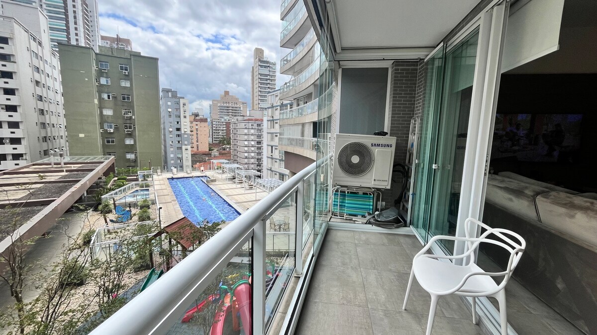 Árasán nua - aimseartha ar thrá Aparecida. Suíomh den scoth, foirgneamh os comhair na trá, gar do na beáir de chainéal 5 agus ionad siopadóireachta Praiamar. Ar urlár ard, le radharc páirteach ar an bhfarraige, ar 3 bhalcóin. Cistin dea - fheistithe (gríoscán gáis, micreathonnán, oigheann leictreach, barr cócaireachta, grúdlann, siléar fíona, déantóirí caife agus miasniteoir). Seomra folctha sóisialta. Svuít le leaba bhanríona, guairneán agus seomra folctha. Seomra leapa le 2 leaba shingil rí. Tocht/tolg ar fáil. Níochán le meaisín. Aerchóirithe.