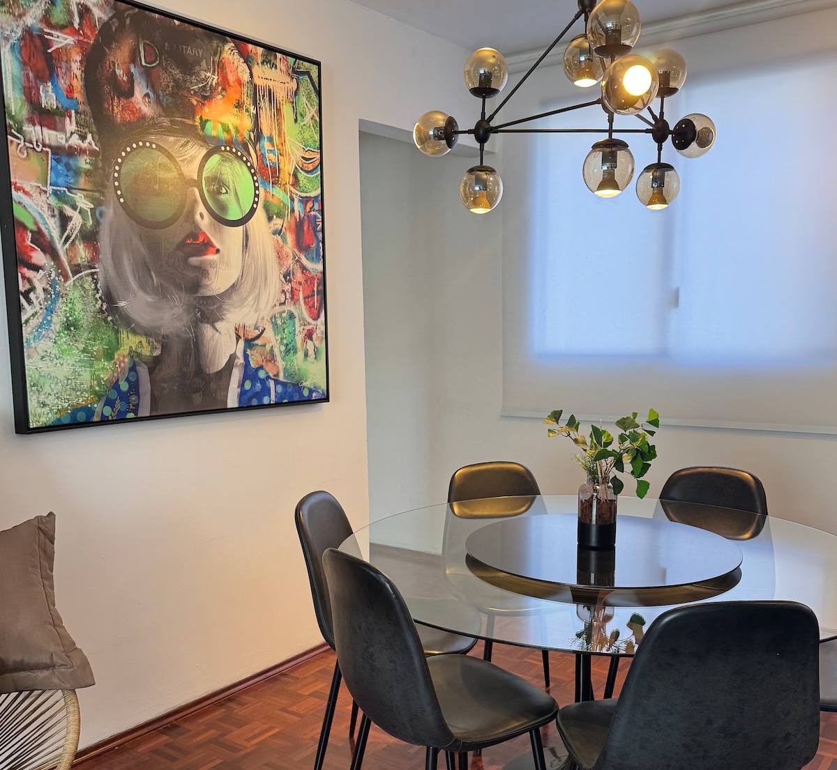 Árasán stiúideo 32m2, cluthar agus iomlán. Leaba bhanríona, A/C , 230 MB, téitheoir gáis, teilifís chliste le Chormecast, uirlisí cistine iomlána, déantóir caife leictreach, seomra suí le tolg agus tábla oibre, cliabhán iniompartha. Radharc saor in aisce ar an gcearnóg agus Jd.Colinas lárnach. Páirceáil faoi chumhdach, linn snámha, níochán sóisialta, ionad aclaíochta, spás Oifig an Tí le Wi - Fi agus concierge 24 uair an chloig. Tá glas leictreonach agus 1 spás páirceála clúdaithe ann. Tá mionmhargadh san fhoirgneamh ar an mbunurlár le roinnt earraí.
