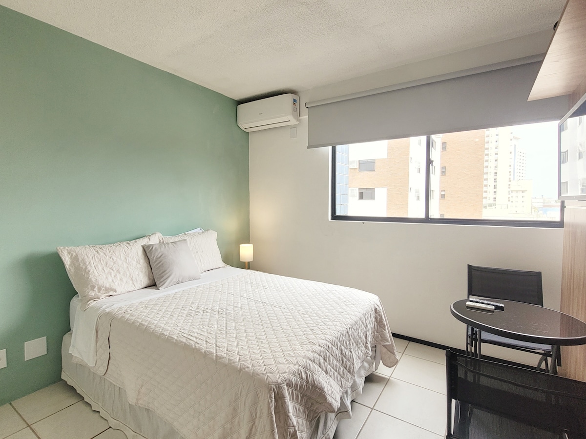 Studio próximo à praia para 2 pessoas ✔️ apartamento compacto com dormitório, cozinha integrada no mesmo ambiente, mesa para refeições e banheiro privativo ✔️ wi-fi, ar condicionado, smart TV, água filtrada ✔️ melhor localização da cidade, a 150m da praia (5min a pé), frente à principal avenida, próx. a mercado, lavanderia, farmácia, restaurantes e bares, 15 min. de carro do Centro Histórico de São Luís ✔️ localização segura com portaria 24h