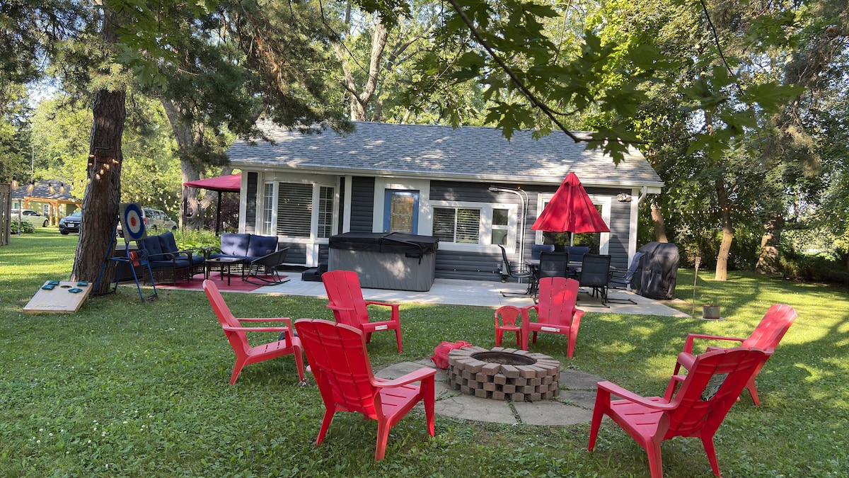 NO HIDDEN FEES! Rates shown reflect the Grand Total, including taxes and cleaning fee. Welcome to our Nordic Spa - A year-round space of relaxation, away from the hustle and bustle, and complete with private sauna, hot tub, and cold plunge. Enjoy a peaceful stay in our cottage, located in beautiful Grand Bend. The home is equipped with AC, gas fireplace, WiFi, full kitchen, workspace, and two spacious patios. Explore the nearby Pinery Park, Grand Bend Beach, Ipperwash Beach and more!