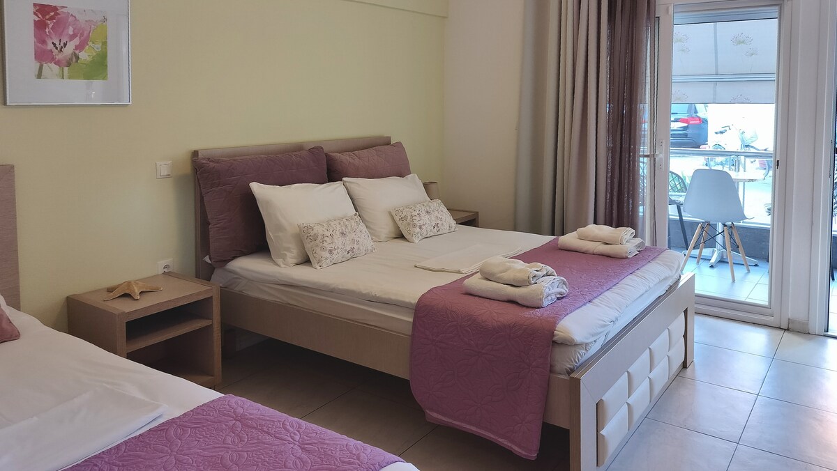 Bain sult as radhairc áille na farraige in áit iontach, díreach siúlóid ghearr ar shiúl ón trá, siopaí áitiúla, beáir agus restaraunts de Sarti. Is seomra stiúideo é seo ina bhfuil leaba bhanríona. Tá balcóin phríobháideach, seomra folctha/cithfholcadán laistigh agus cistinéad i ngach árasán. Leaba bhreise ar fáil ar reqeuest.