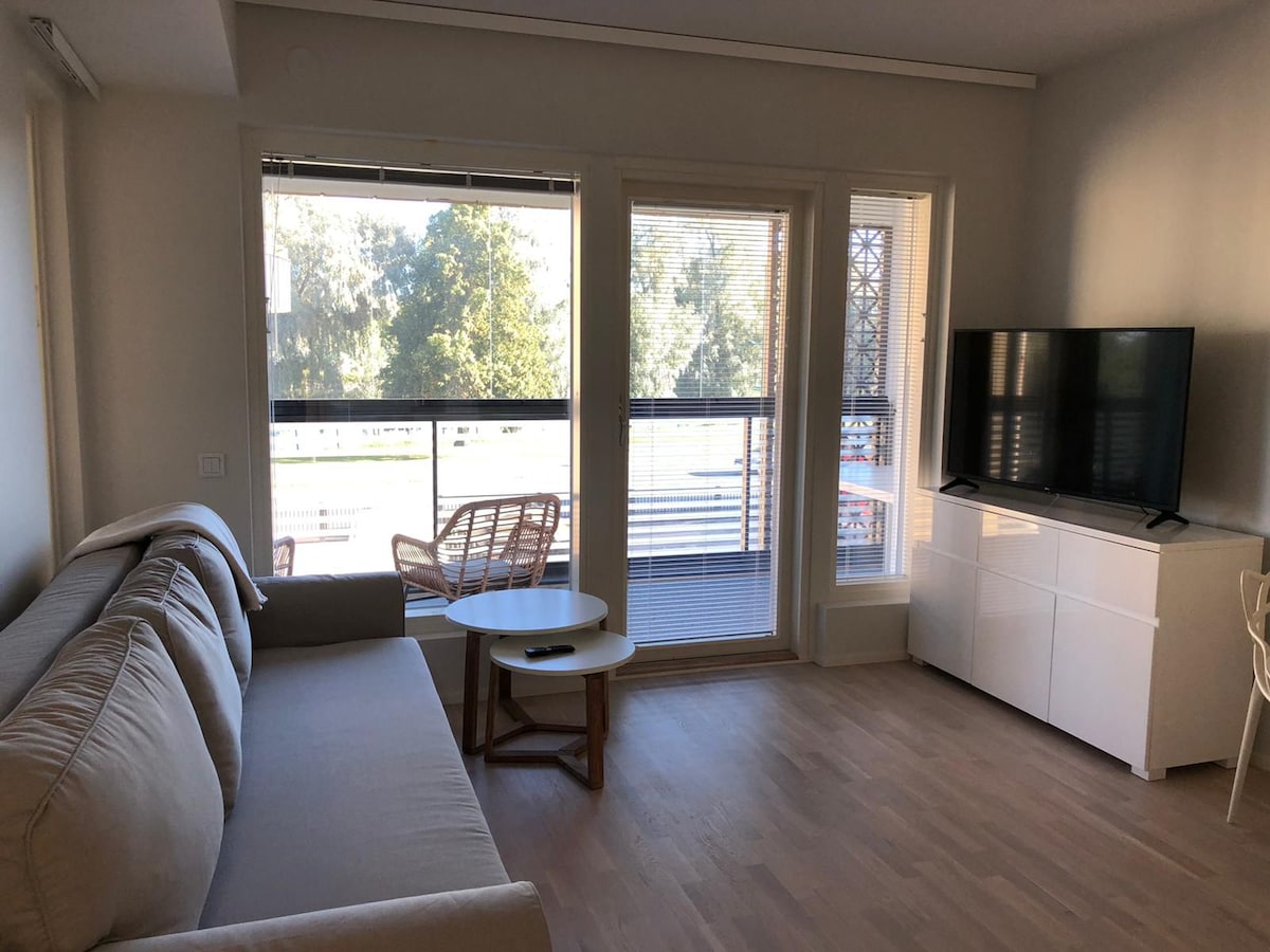 Árasán aon seomra geal i suíomh iontach díreach in aice le hionad siopadóireachta Puuvilla agus ionad na hollscoile. Tá sé achar gearr siúil go dtí an bruach abhann agus tá Kirjurinluoto in aice láimhe. Tá an árasán nua agus dea-fheistithe, tá troscán, soithí agus áiseanna bunúsacha ar fáil. Tá leaba dhúbailte agus tolg leapa ar féidir é a leathadh amach mar leaba dhúbailte san árasán. Más gá, tá leaba bhreise ar fáil do dhuine amháin. Tá wifi san árasán agus tá áit páirceála le soicéad leictreach ar fáil don aoi sa chlós. Tá clós beag príobháideach ag an árasán freisin.